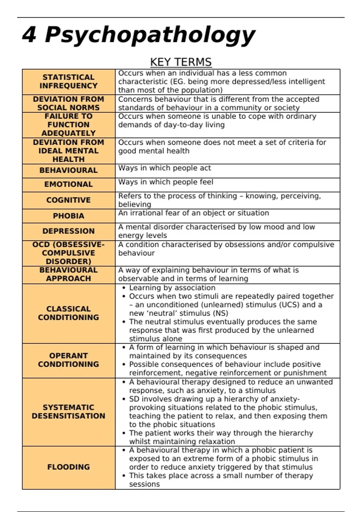 Psychopathology Complete Revision Guide - A-Level Psychology Description: Ace your Psychopathology exam with these structured notes covering definitions, characteristics, and treatments of mental disorders. Definitions of Abnormality: Statistical infrequency, deviation from social norms, failure to function adequately, and deviation from ideal mental health. Disorders Covered: Detailed behavioural, emotional, and cognitive characteristics of Phobias, Depression, and OCD. Approaches & Treatments: Explains the Two-Process Model for phobias (including Systematic Desensitisation and Flooding), Beck’s Cognitive Triad and Ellis’ ABC Model for depression (including CBT), and the Biological Approach for OCD.