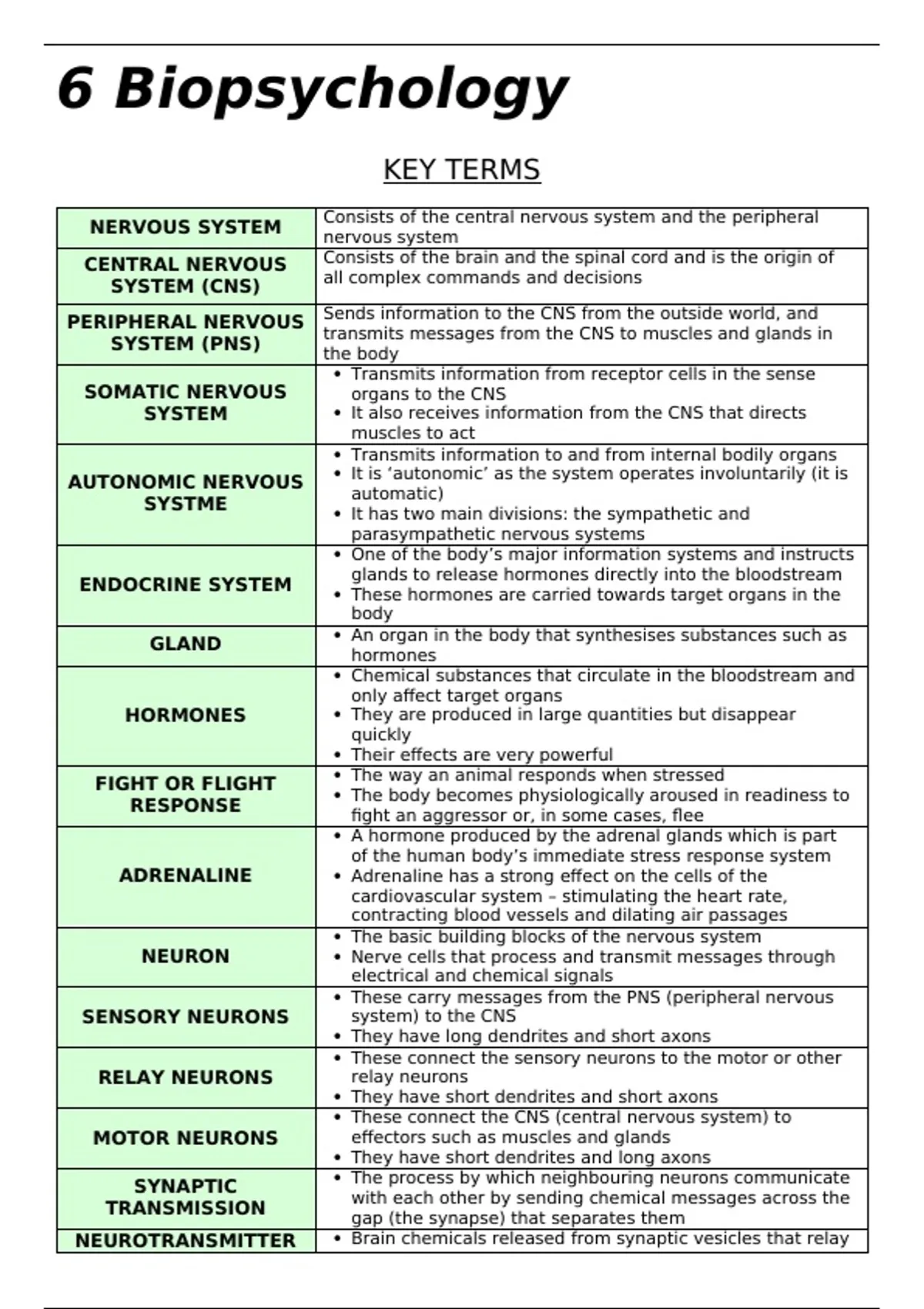 Complete Biopsychology Revision Notes - A-Level Psychology Description: Simplify the complex world of Biopsychology with these clear and concise revision notes to achieve A/A*. Biological Systems: Detailed breakdown of the Central Nervous System (CNS), Peripheral Nervous System (PNS), and the Endocrine System. Neural Processes: Comprehensive guides on the structure and function of neurons (Sensory, Relay, Motor) and the intricacies of Synaptic Transmission. Stress Response: Clear explanation of the Fight or Flight response and the role of adrenaline. Advanced Topics: Includes localization of function, excitation, and inhibition.