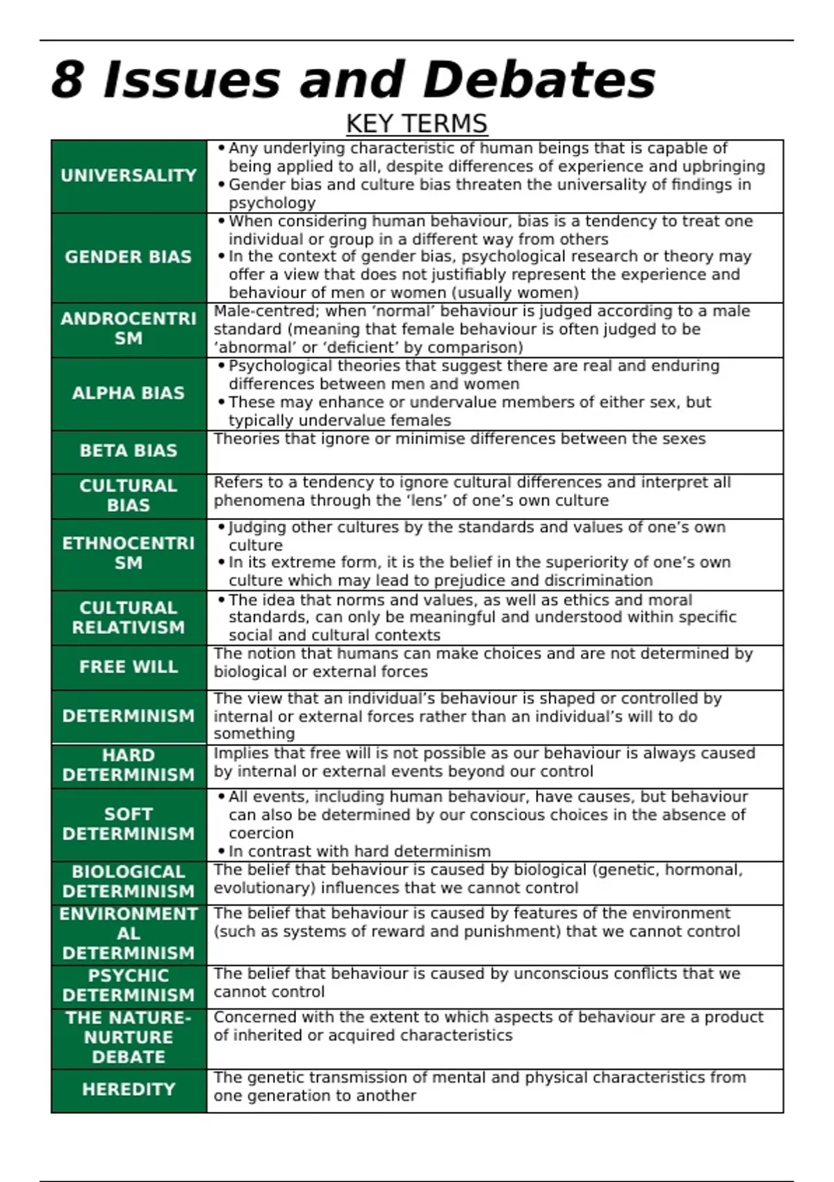 Issues and Debates in Psychology - Complete Revision Guide Critically analyse the core Issues and Debates that run through the entire psychology specification. Bias in Research: In-depth look at Gender Bias (Alpha/Beta bias, Androcentrism) and Cultural Bias (Ethnocentrism, Cultural Relativism). Universal Themes: Discussion on the universality of findings and how bias threatens psychological research. Perfect for AO3: These notes provide the high-level evaluative content needed for top-mark essays.