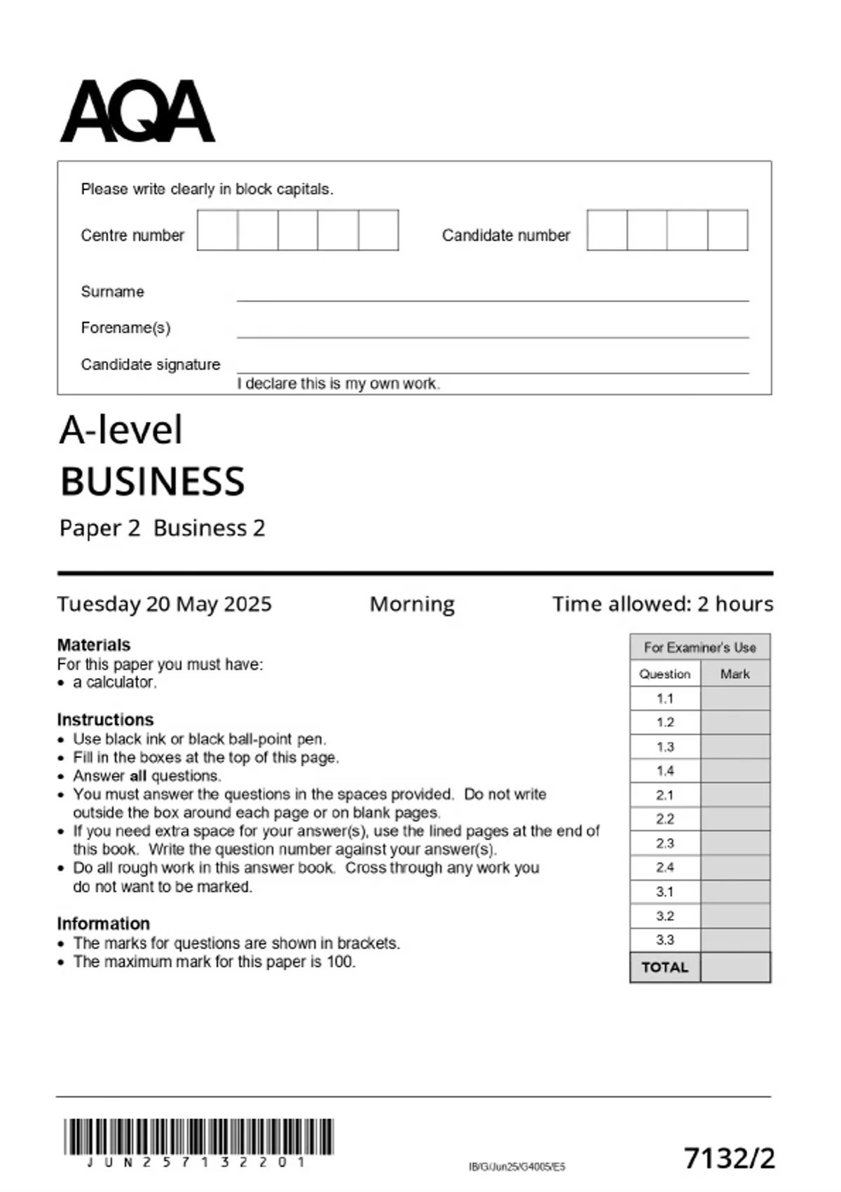 2025 AQA A-LEVEL Business 7132/2 Paper 2 MERGED QUESTION PAPER & MARKSCHEME