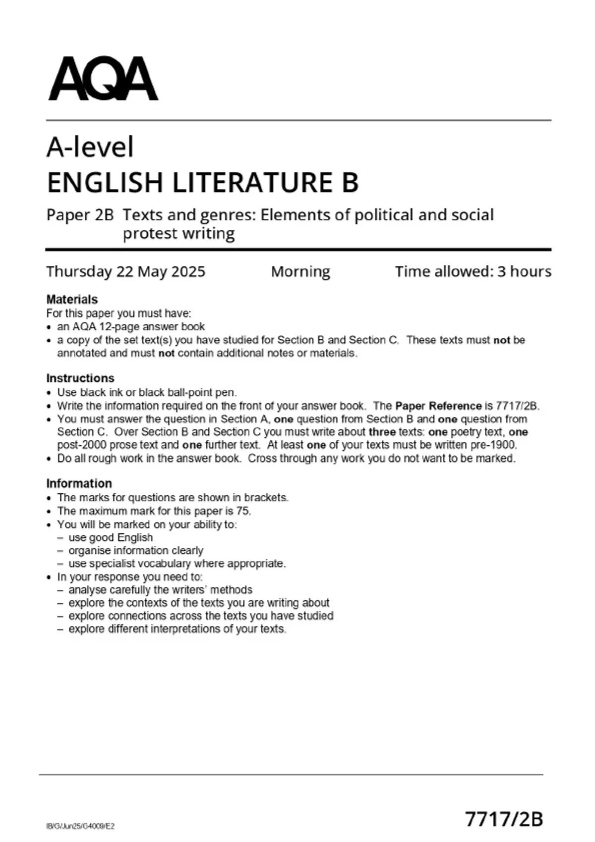 2025 AQA A-LEVEL English Literature B Paper 2B 7717/2B Texts and genres: Elements of political and social protest writing MERGED QUESTION PAPER & MARKSCHEME