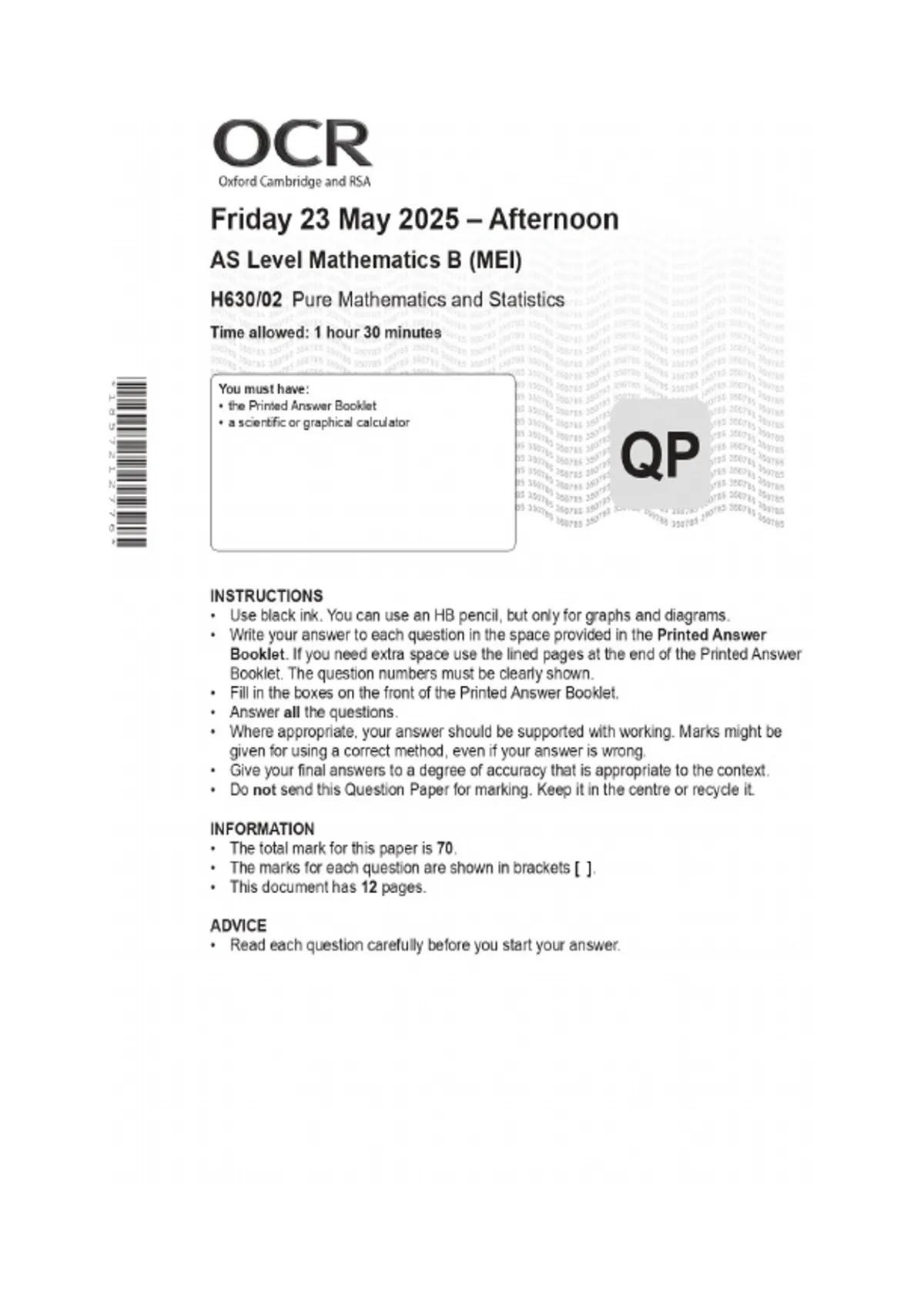 Questions and correct answers for the as level mathematics b (mei) h630/02 pure mathematics and statistics exam, held on friday 23 may 2025. It includes instructions for the exam, formulae, and a variety of math problems covering topics such as binomial series, differentiation, statistics, and geometry. Designed to help students prepare for their exams by providing practice questions and solutions, enhancing their understanding of key mathematical concepts and problem-solving skills. It also includes diagrams and graphs to aid in visualization and comprehension.