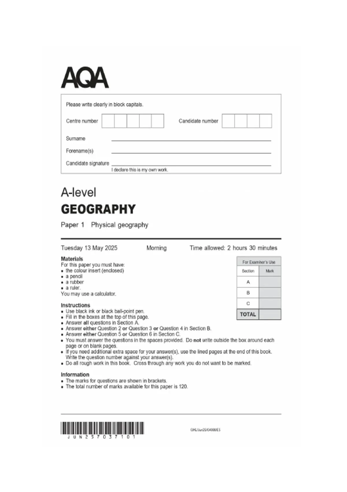 aqa a level geography paper 1 2025 exam merged with mark scheme