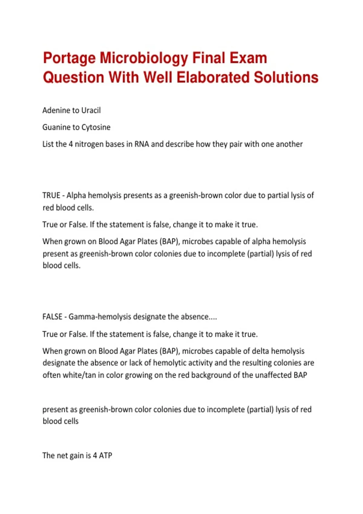 Portage Microbiology Final Exam Question With Well Elaborated Solutions Adenine to Uracil Guanine to Cytosine List the 4 nitrogen bases in RNA and describe how they pair with one another TRUE - Alpha hemolysis presents as a greenish-brown color due to partial lysis of red blood cells. True or False. If the statement is false, change it to make it true. When grown on Blood Agar Plates (BAP), microbes capable of alpha hemolysis present as greenish-brown color colonies due to incomplete (partial) lysis of red blood cells. FALSE - Gamma-hemolysis designate the absence.... True or False. If the statement is false, change it to make it true. When grown on Blood Agar Plates (BAP), microbes capable of delta hemolysis designate the absence or lack of hemolytic activity and the resulting colonies are often white/tan in color growing on the red background of the unaffected BAP present as greenish-brown color colonies due to incomplete (partial) lysis of red blood cells The net gain is 4 ATP Each of the following statements about glycolysis is true, except: - Reactants include glucose, NAD, and ATP - 2 molecules of ATP are required as reactants - The net gain is 4 ATP - Products include pyruvate, NADH, ATP, and H+ it does not produce atp Each of the following statements about respiration are true, except: - it is an aerobic process - it does not produce atp - it produces NADH and FADH2 in abundance -the central cycle is called the tricarboxylic acid cycle Lytic bacteriophages replicate within the host bacteria until it ruptures, whereas temperate (or lysogenic) phages primarily exist in a non-replicative state that does not kill the host cell. Describe the ONE main differences between lytic and temperate phages. 1. it replicates in the host cell until the host ruptures 2. it replicates all proteins that it needs to assemble new virus particles describe TWO main characteristics of LYTIC bacteriophage replication Vibrio Bacteria that have a curved rod morphology are referred to as ______. A wet mount stain is indicated. A small liquid culture (usually just a drop) containing a microorganism of interest is prepared, added to a slide, and then covered with a glass coverslip. The coverslip is present to both protect the objective and the specimen while also holding the microorganism in place. Wet mounts are used to observe the motility and behavior of an organism. You want to observe the movement of microorganisms that are present in a sample of cheek cells obtained on a patient. Briefly explain the technique that you would use and how it is performed. it uses a solution of positively charged dye, which binds to and stains the negatively changed membrane of the microorganism.
