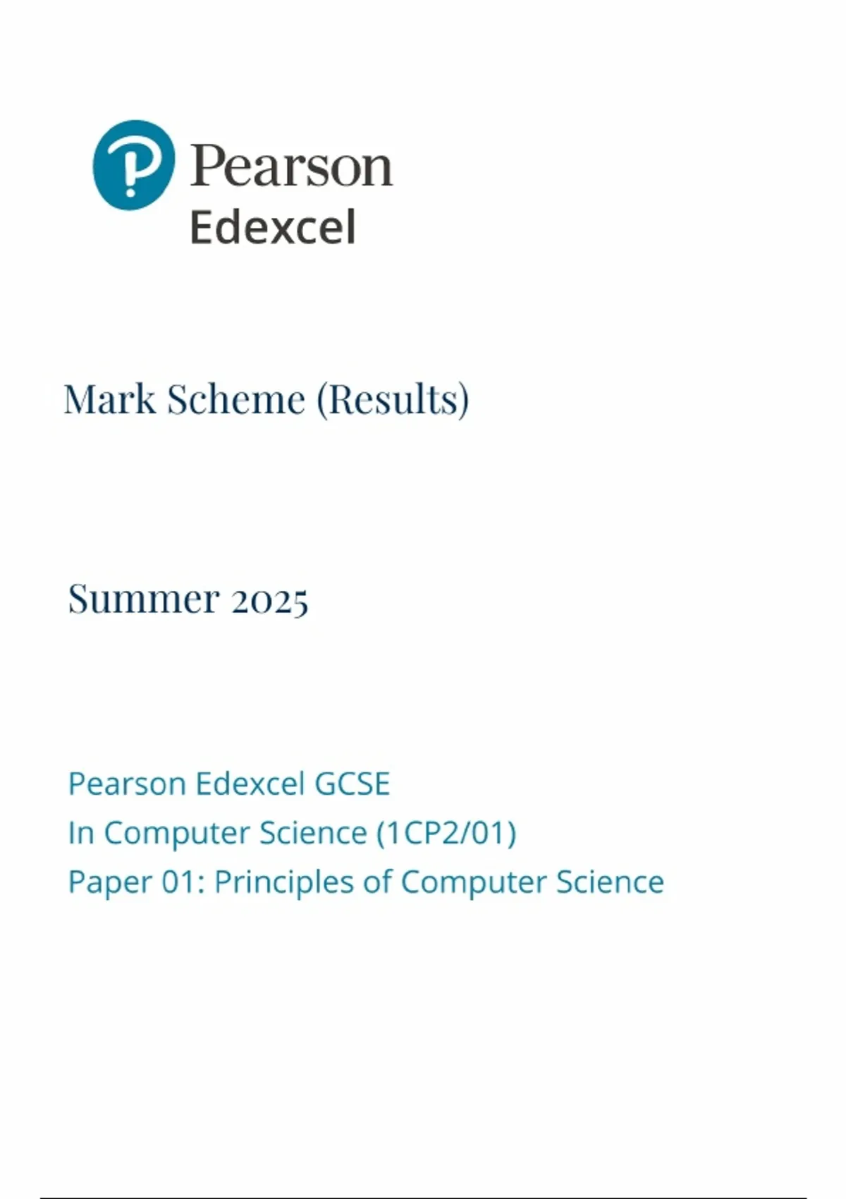 2025 Pearson Edexcel GCSE Computer Science PAPER 1 MARK SCHEME 1CP2/01 : Principles of Computer Science
