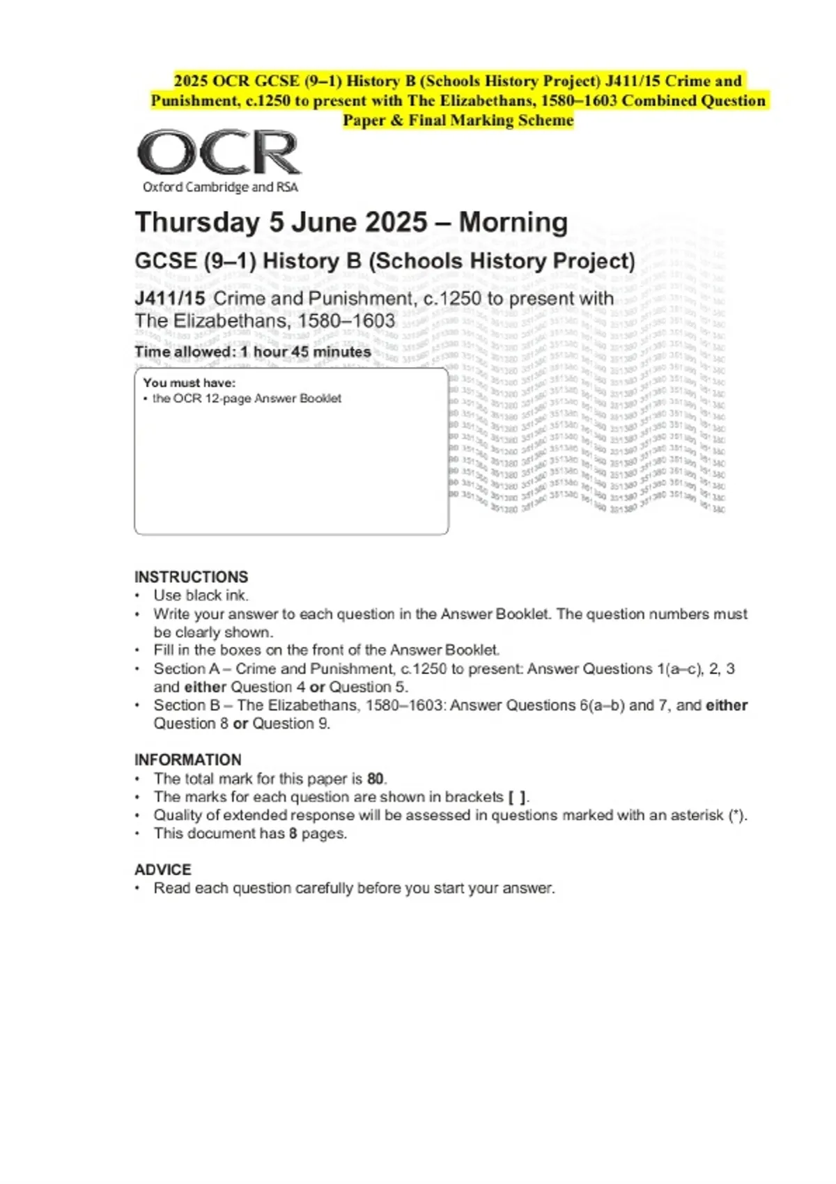 2025 OCR GCSE (9–1) History B (Schools History Project) J411/15 Crime and Punishment, c.1250 to present with The Elizabethans, 1580–1603 Combined Question Paper and Marking Scheme