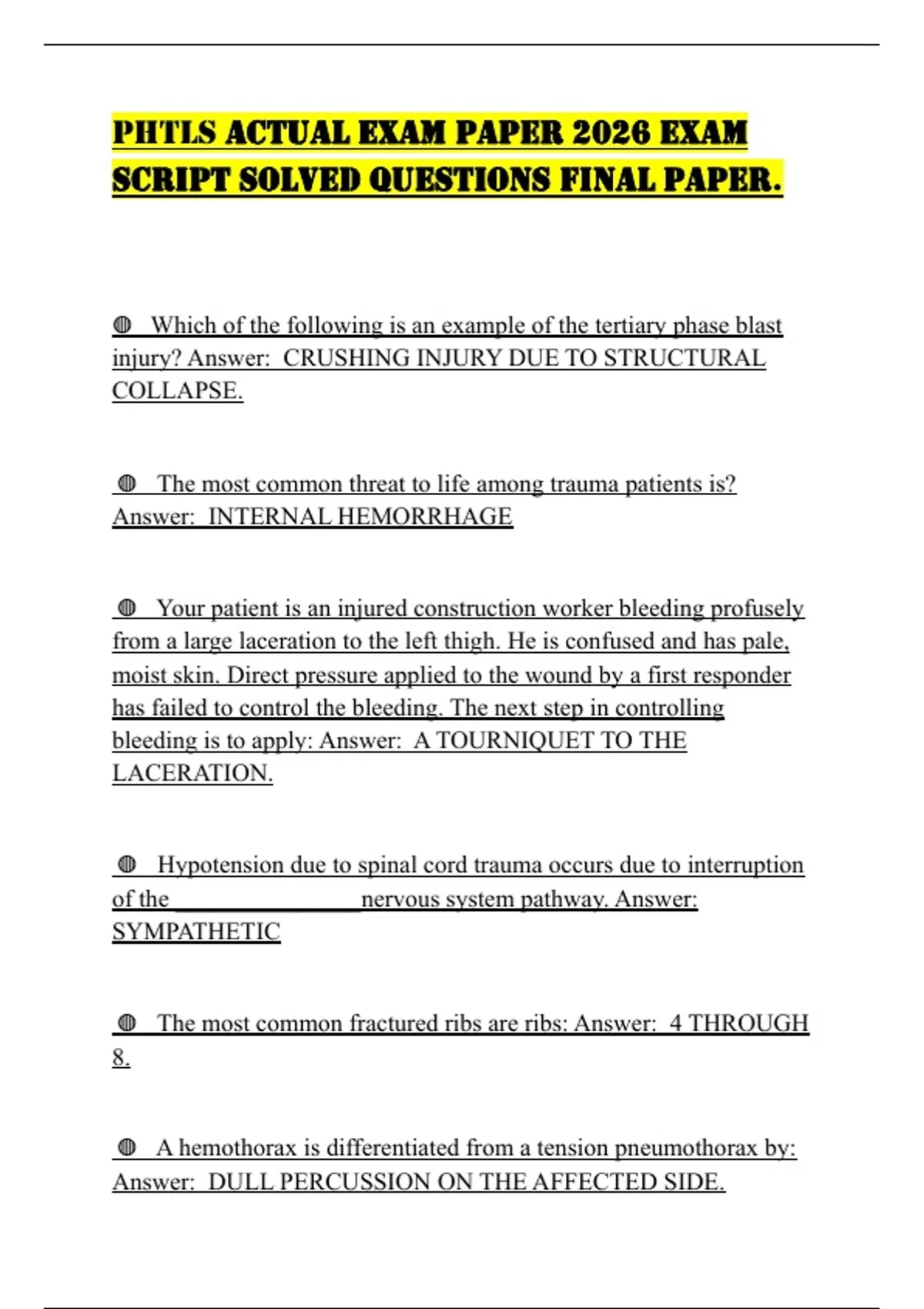 PHTLS ACTUAL EXAM PAPER 2026 EXAM SCRIPT SOLVED QUESTIONS FINAL PAPER.