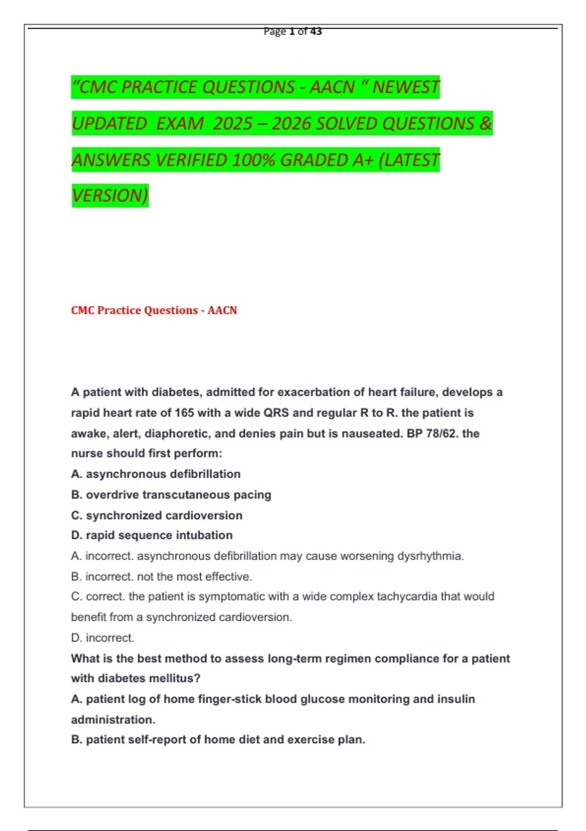 “CMC PRACTICE QUESTIONS - AACN “ NEWEST UPDATED EXAM 2025 – 2026 SOLVED QUESTIONS & ANSWERS VERIFIED 100% GRADED A+ (LATEST VERSION)