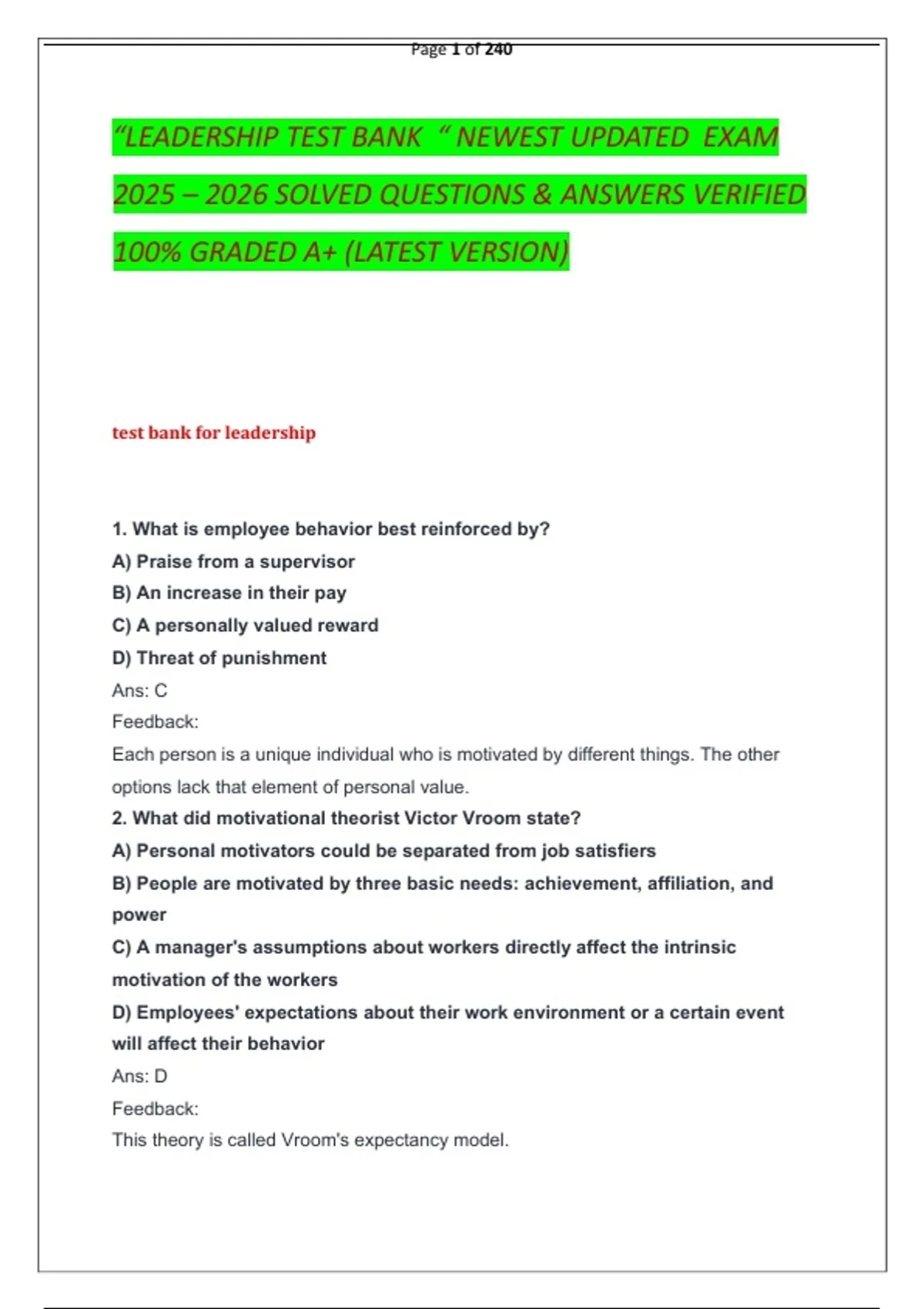 “LEADERSHIP TEST BANK “ NEWEST UPDATED EXAM 2025 – 2026 SOLVED QUESTIONS & ANSWERS VERIFIED 100% GRADED A+ (LATEST VERSION)
