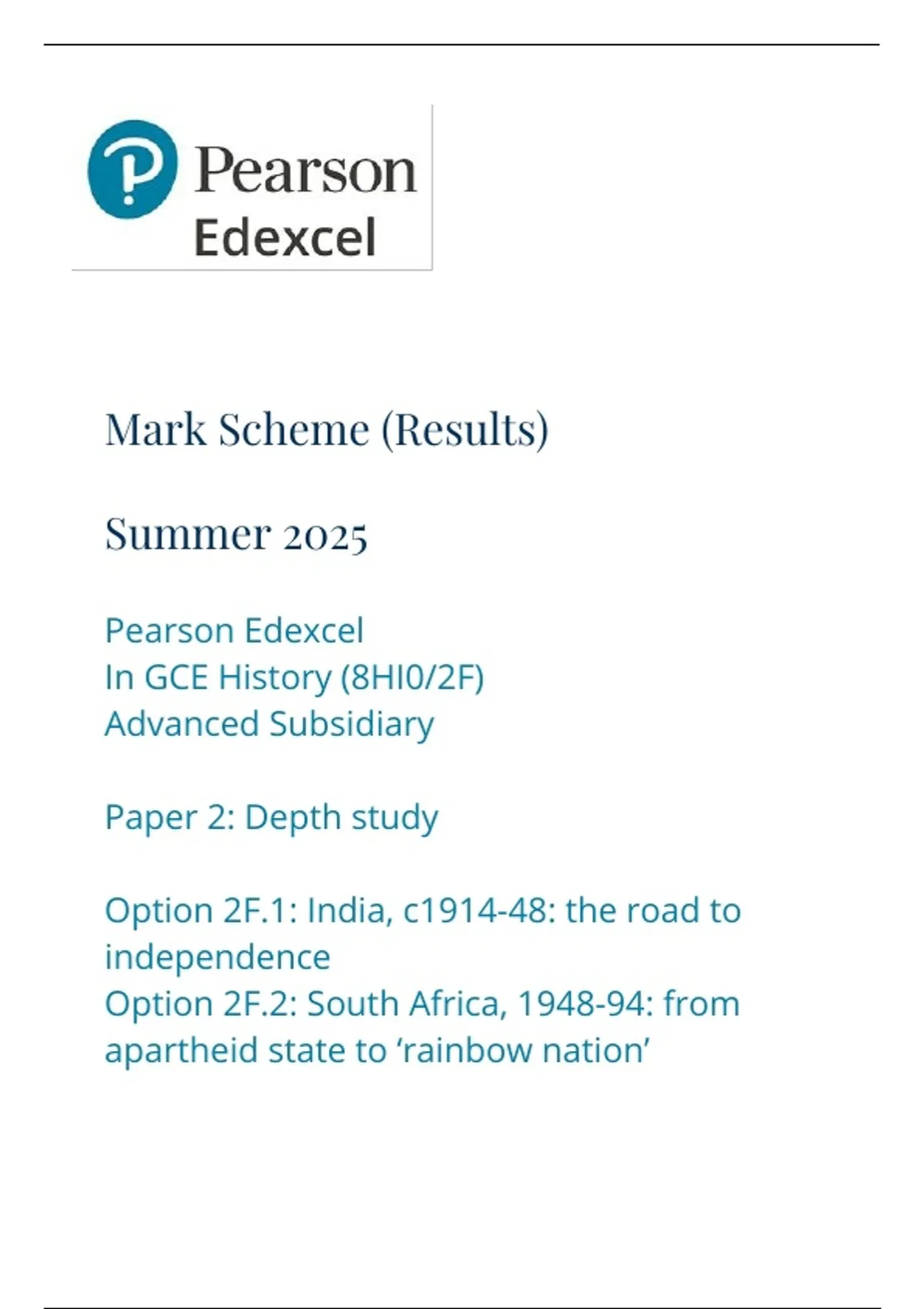 Edexcel A Level History Paper 2 (8HI0/2F) 2025 – Examiner Mark Scheme (June Exam)