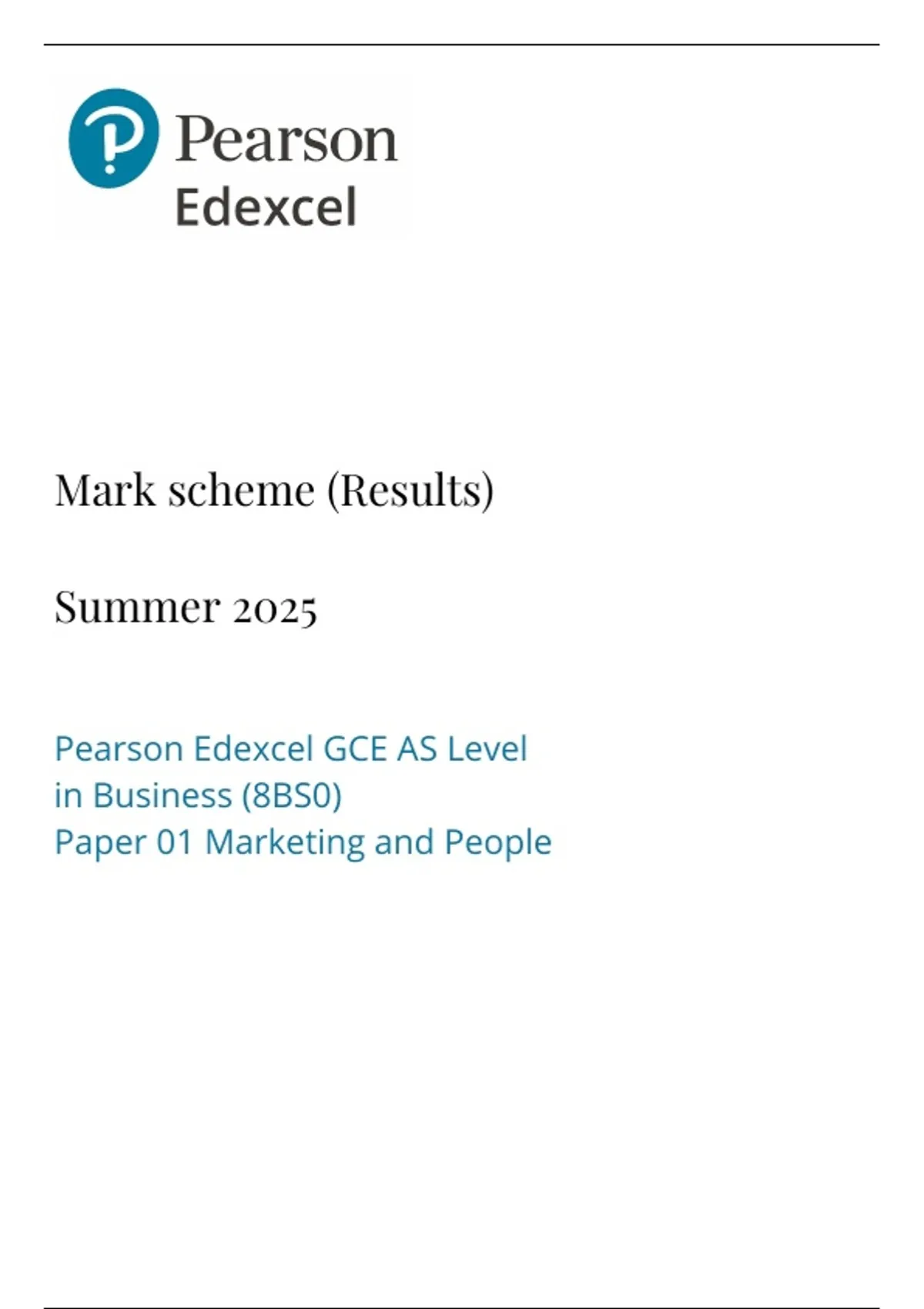 This resource contains the official examiner mark scheme for Edexcel GCE AS Level Business Paper 1 (8BS0/01) – June 2025. It explains how marks are awarded for short-answer questions, data response tasks, and structured business analysis, using clear level-based marking criteria. The mark scheme helps students understand examiner expectations, assessment objectives, and the features required to achieve high-band responses in AS Level Business Paper 1. Ideal for: AS Level Business revision and exam preparation Understanding examiner marking criteria and levels Improving analysis, application, and written responses
