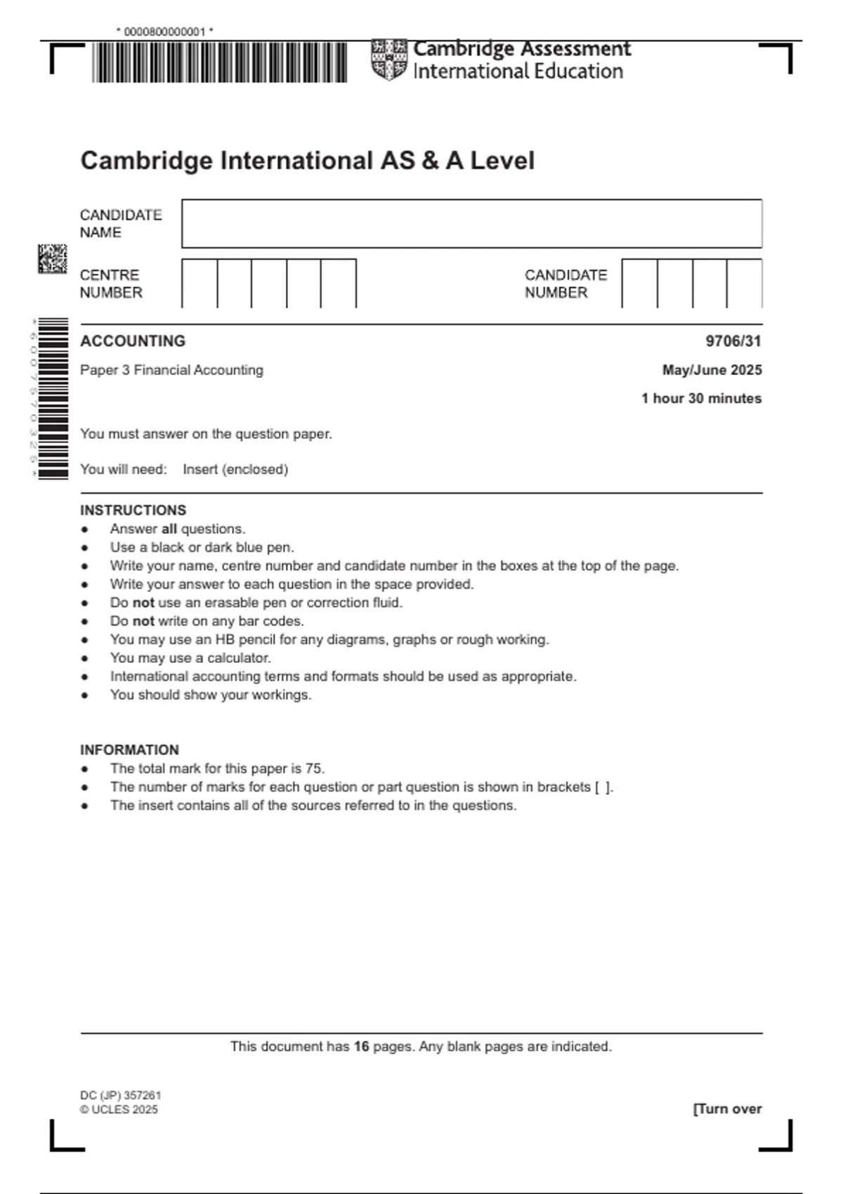 the official Cambridge International A Level Accounting Question Paper for Paper 3/1 (9706/31) – Summer 2025 examination series. Paper 3 assesses advanced accounting knowledge and skills, including preparation and analysis of financial statements, interpretation of accounting information, and application of accounting principles in structured and extended-response questions. It is ideal for exam practice and mock assessments, helping students become confident with Paper 3 structure, depth of response, and Cambridge marking expectations. Official Cambridge exam material for the Summer 2025 series, designed to support accurate assessment and exam analysis.