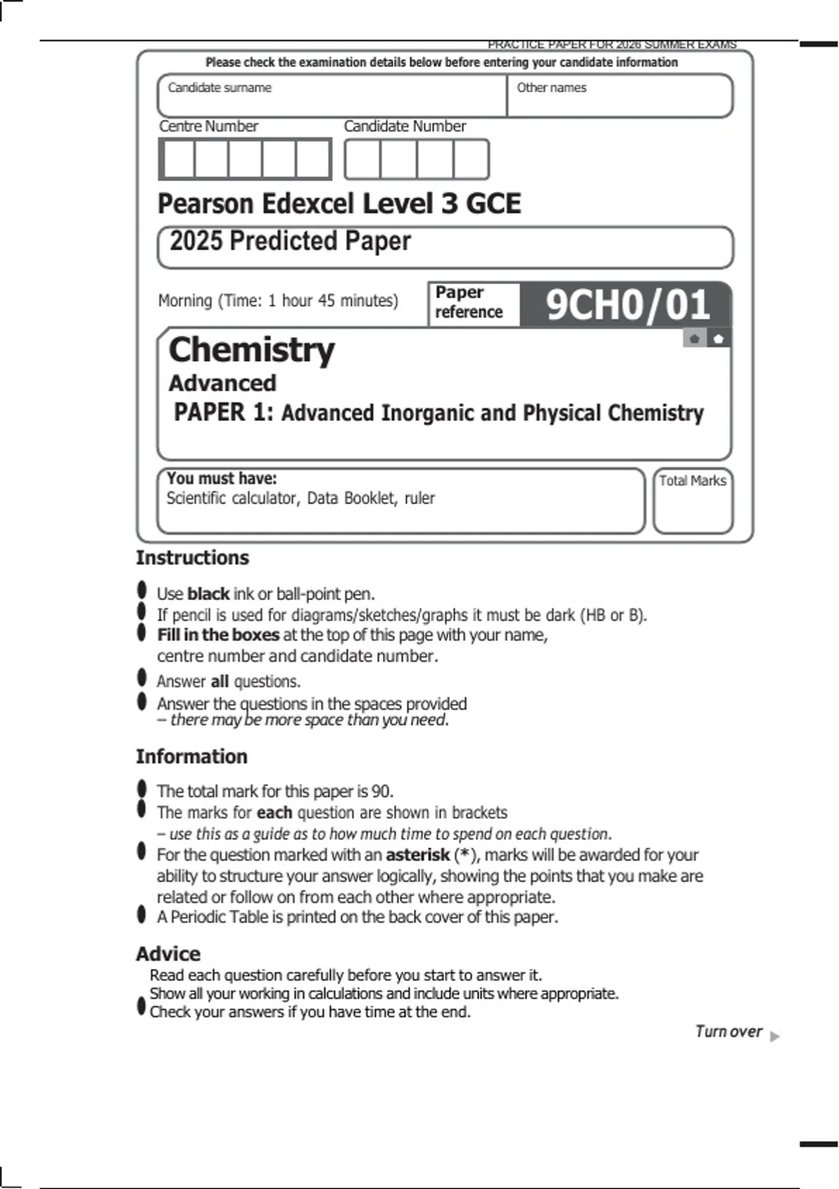 EDEXCEL A LEVEL CHEMISTRY 2026 PRACTICE PAPER 1 QUESTION PAPER 2026 PRACTICE PAPER