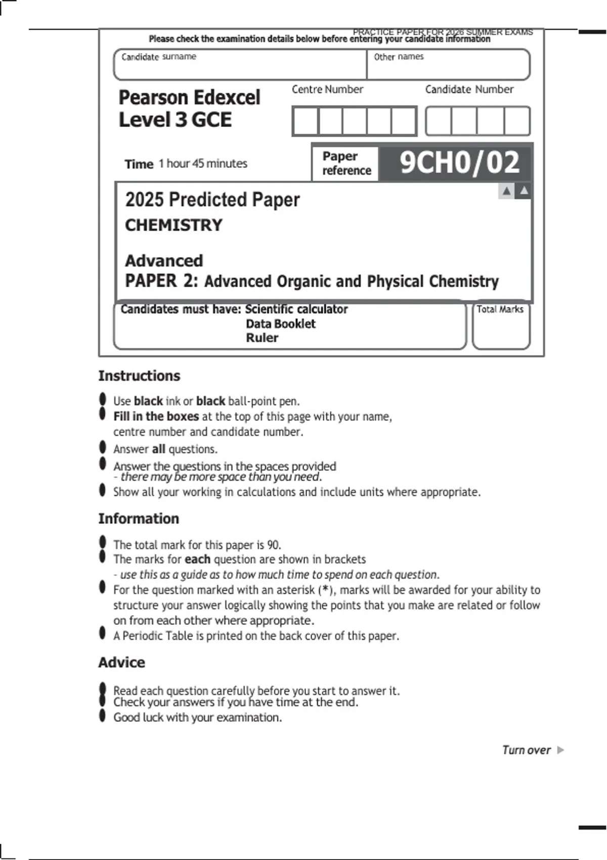 EDEXCEL A LEVEL CHEMISTRY 2026 PRACTICE PAPER 2 QUESTION PAPER 2026 PRACTICE PAPER