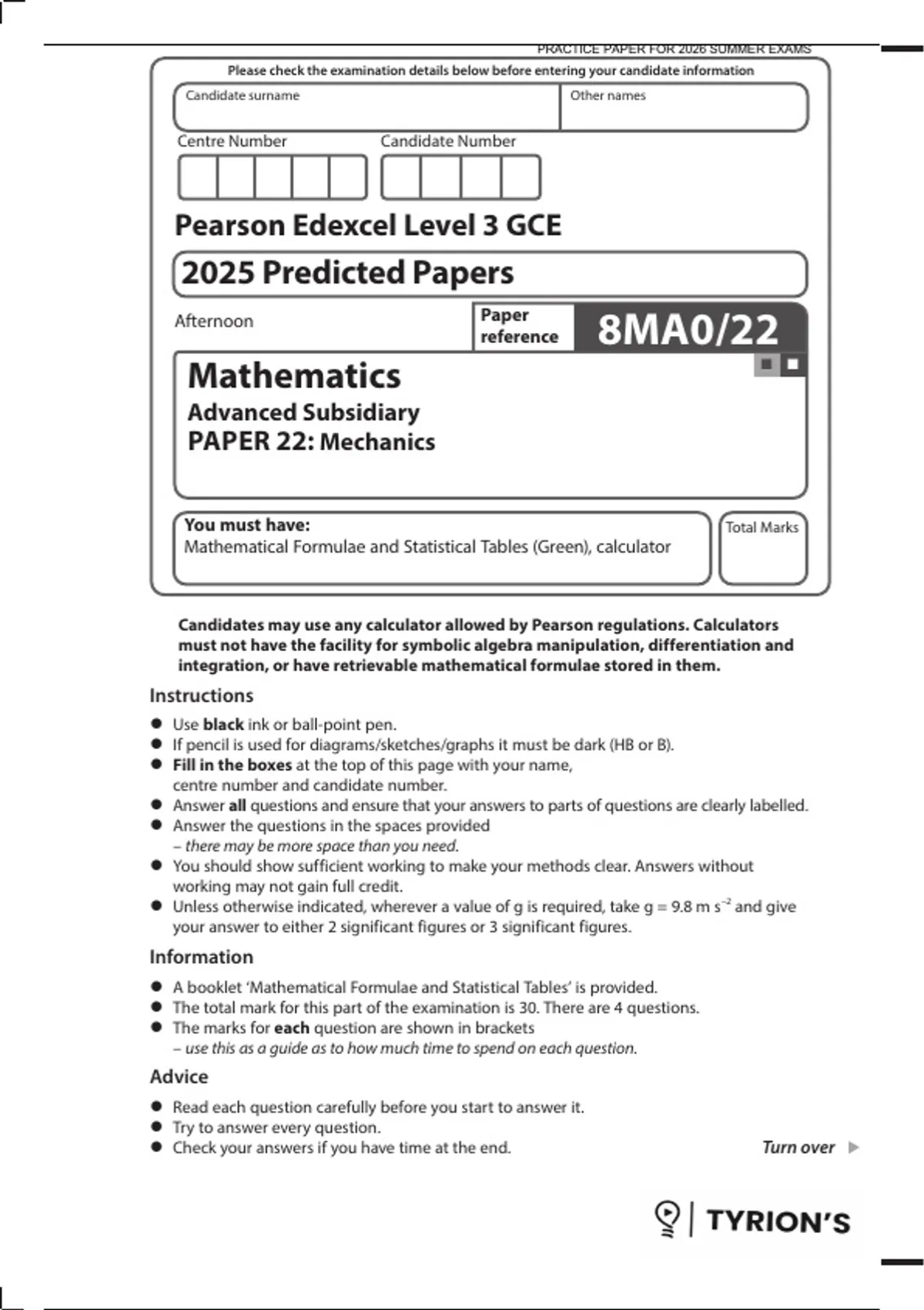 EDEXCEL AS LEVEL MATHS MECHANICS 2025 PREDICTED QP 2026 PRACTICE PAPER