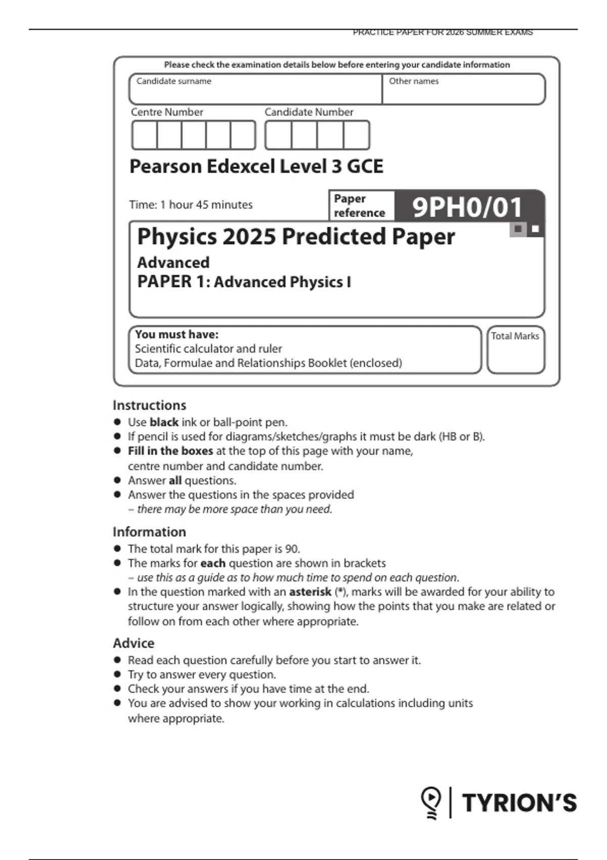 Edexcel AL Physics Question Paper 1 2025 Predicted 2026 PRACTICE PAPER