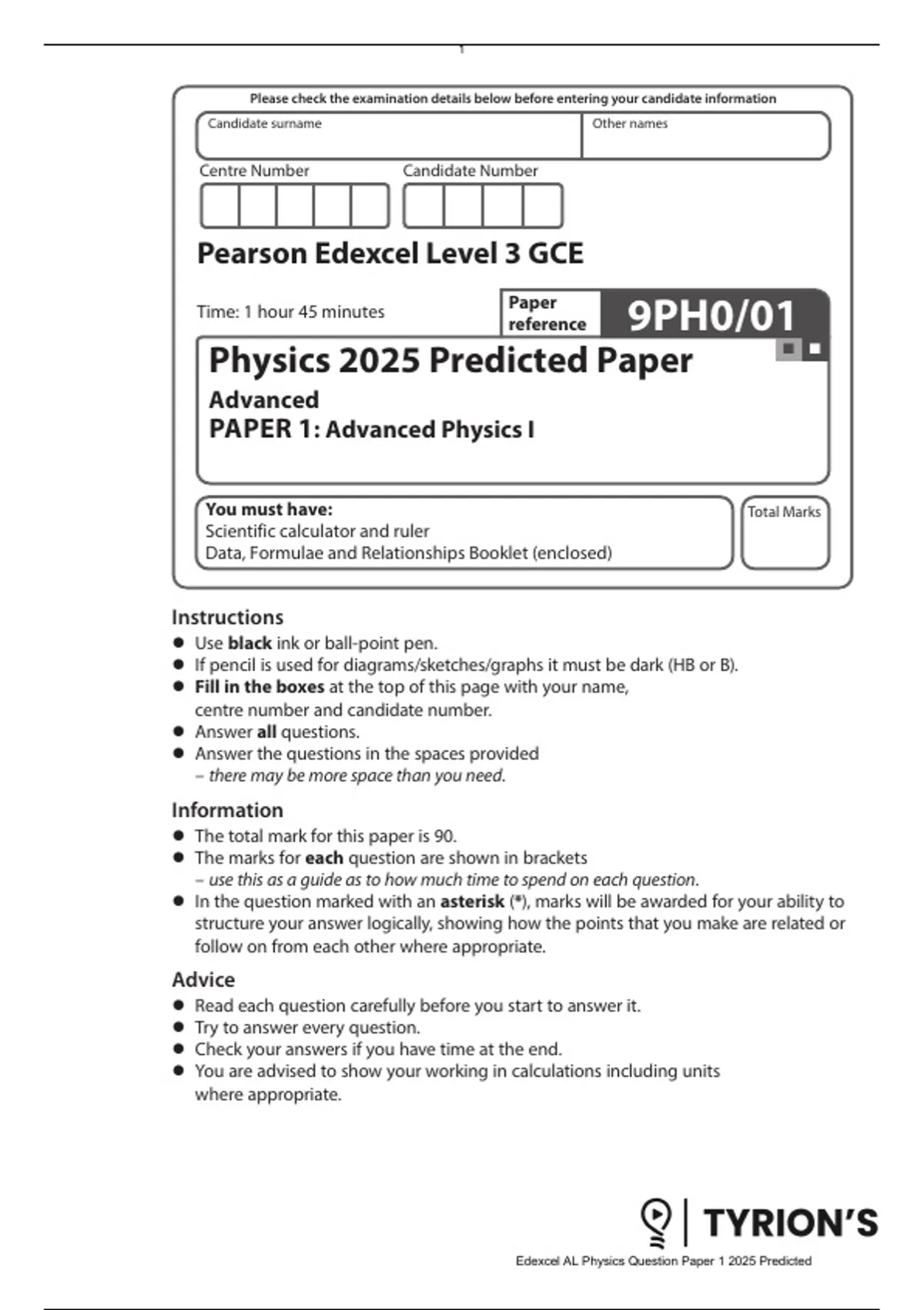 Edexcel AL Physics Question Paper 1 2025 Predicted