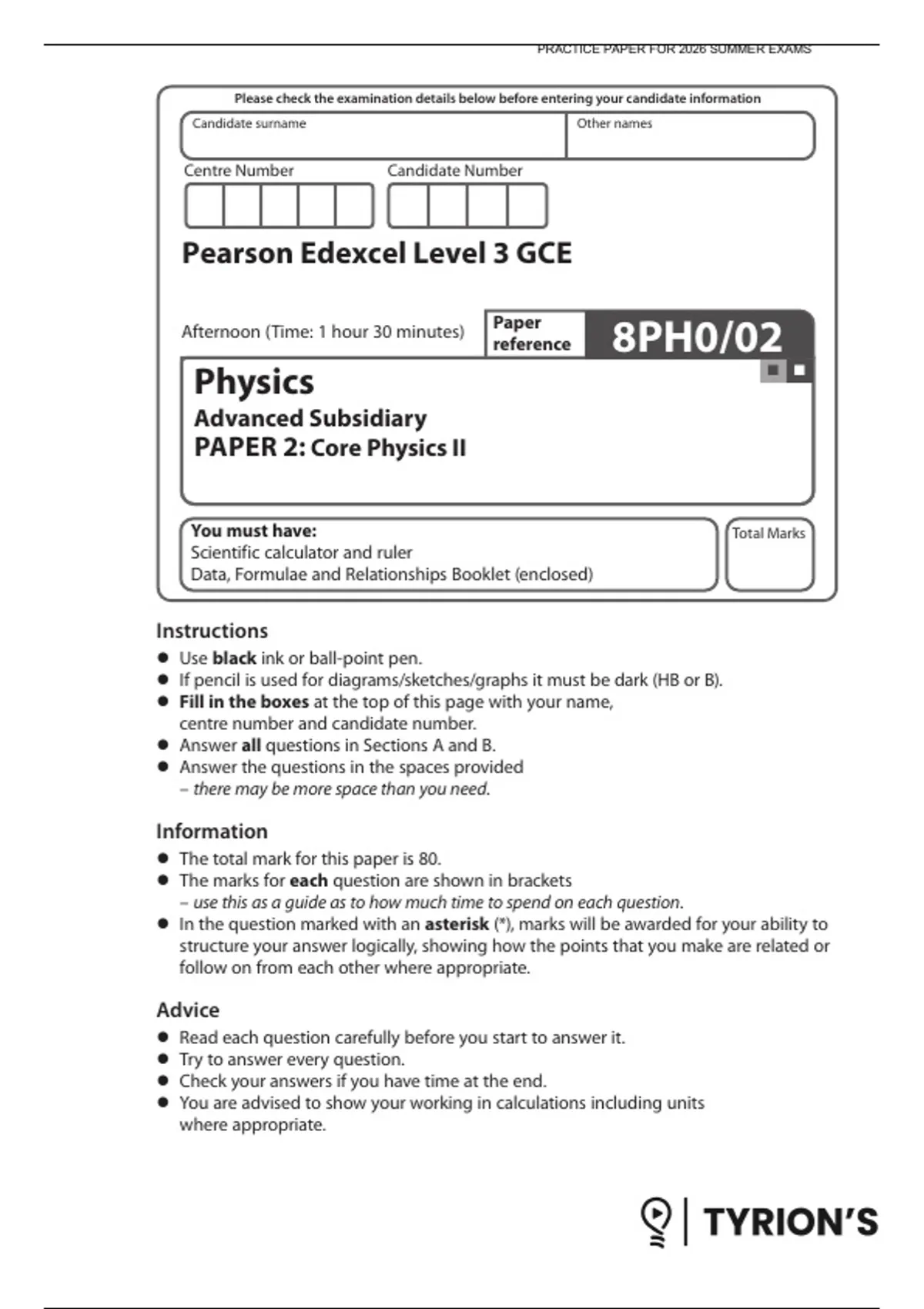 Edexcel AS Physics Question Paper 2 2025 Predicted 2026 PRACTICE PAPER
