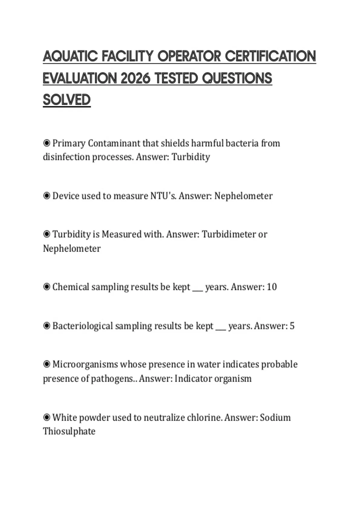 AQUATIC FACILITY OPERATOR CERTIFICATION EVALUATION 2026 TESTED QUESTIONS SOLVED