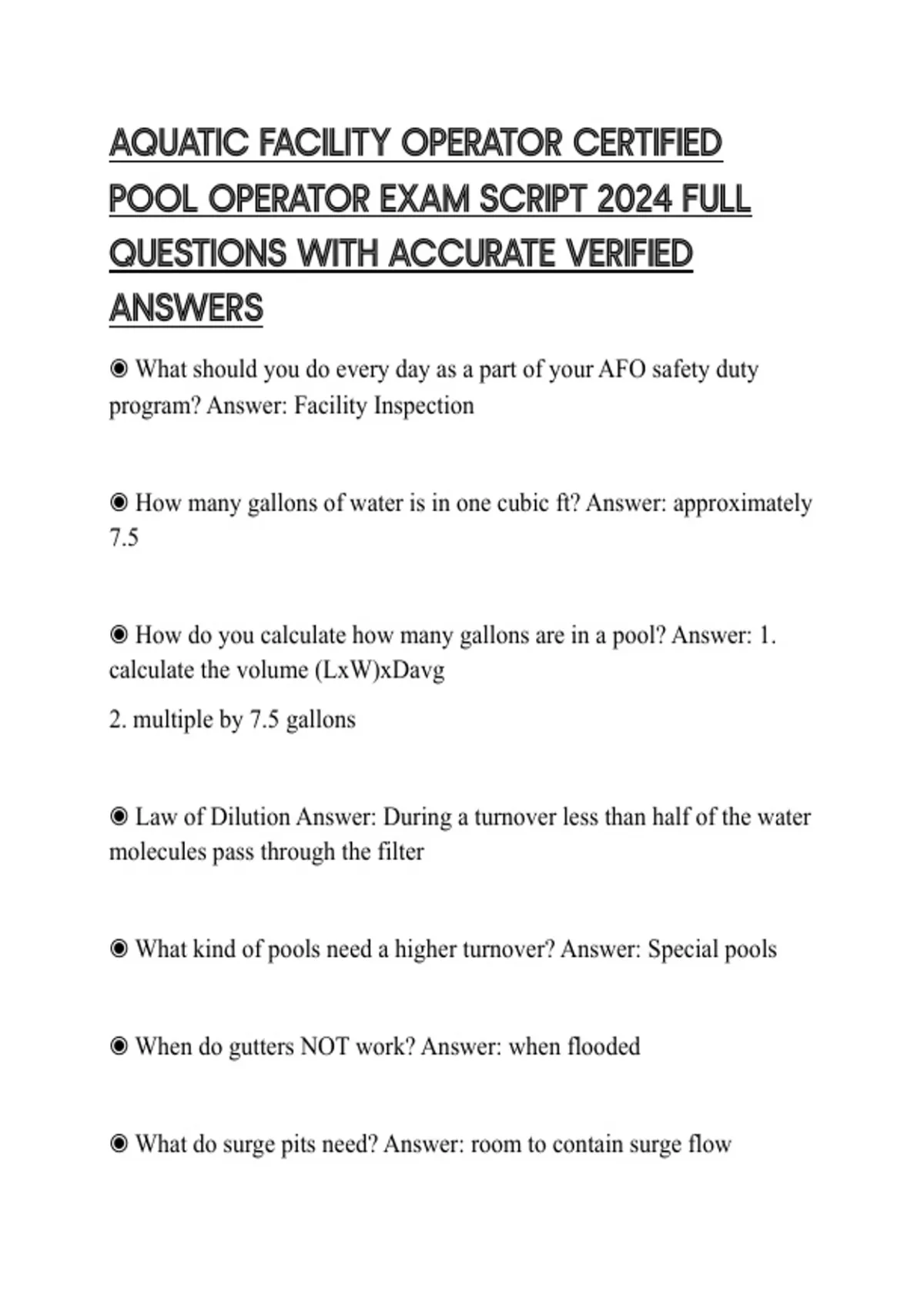 AQUATIC FACILITY OPERATOR CERTIFIED POOL OPERATOR EXAM SCRIPT 2024 FULL QUESTIONS WITH ACCURATE VERIFIED ANSWERS
