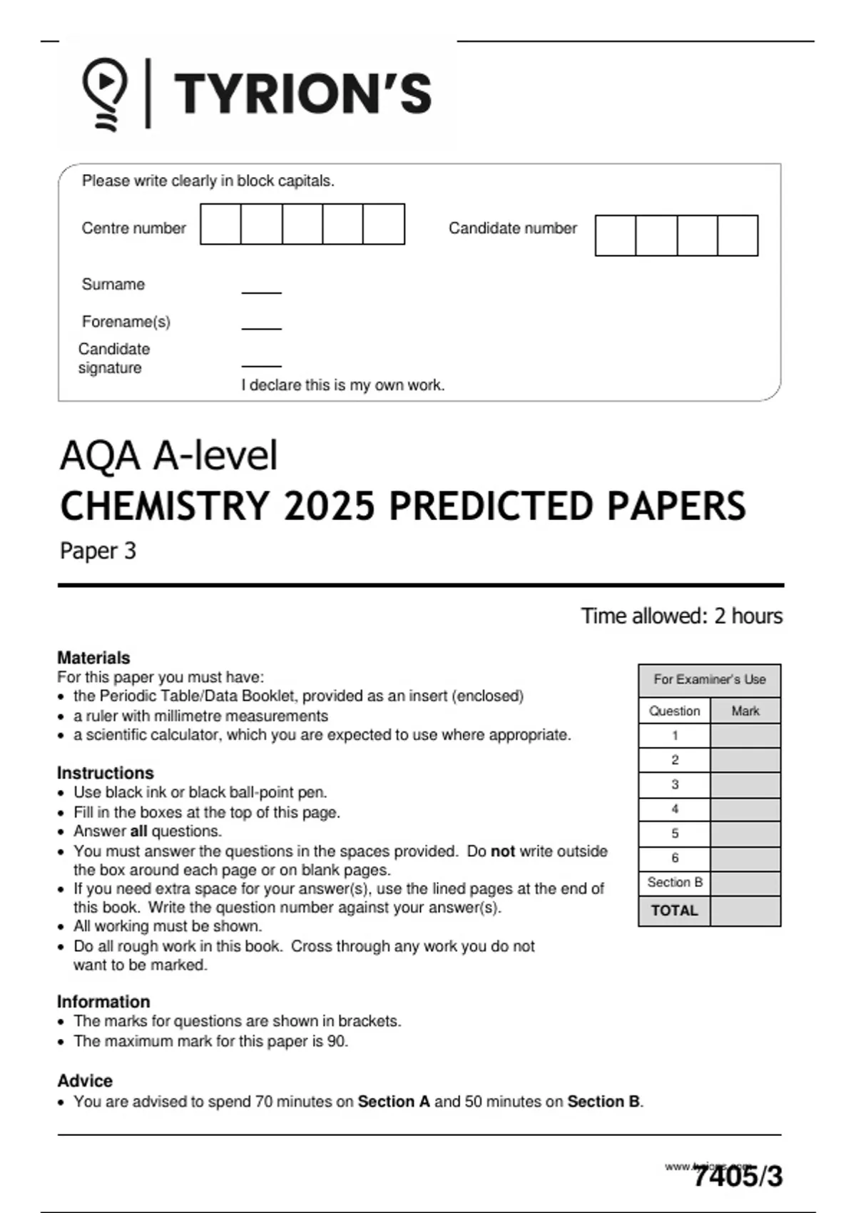 AQA A LEVEL CHEMISTRY PAPER 3 2026 MAY JUNE PRACTICE 2025 PREDICTED PAPER QP