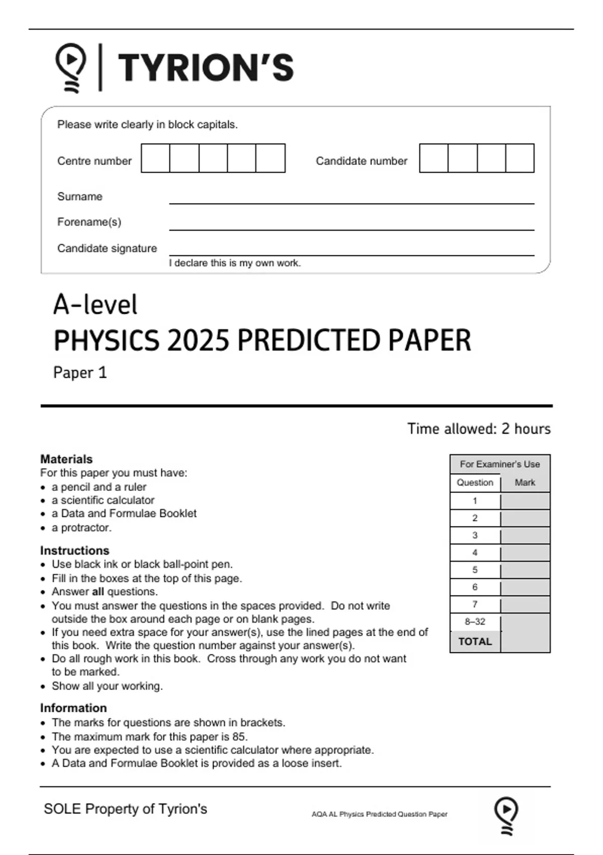 SOLE Property of Tyrion's AQA AL Physics Predicted Question Paper