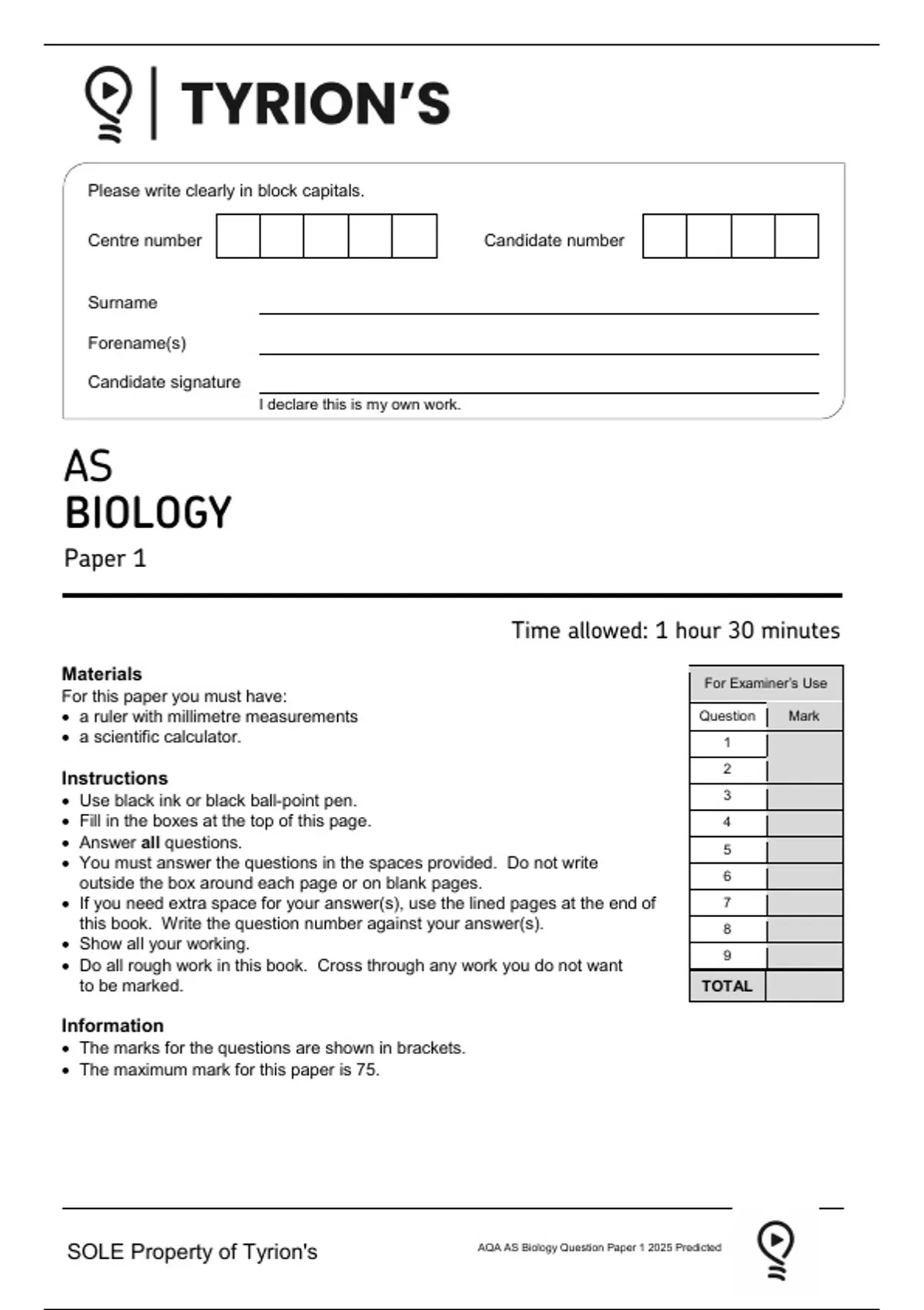 SOLE Property of Tyrion's AQA AS Biology Question Paper 1 2025 Predicted