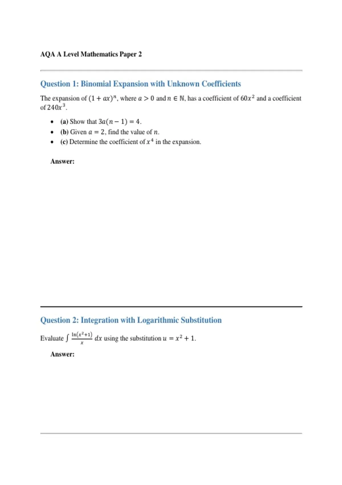 AQA A LEVEL MATHS PAPER 2 SUMMER 2026PRACTICE PAPER