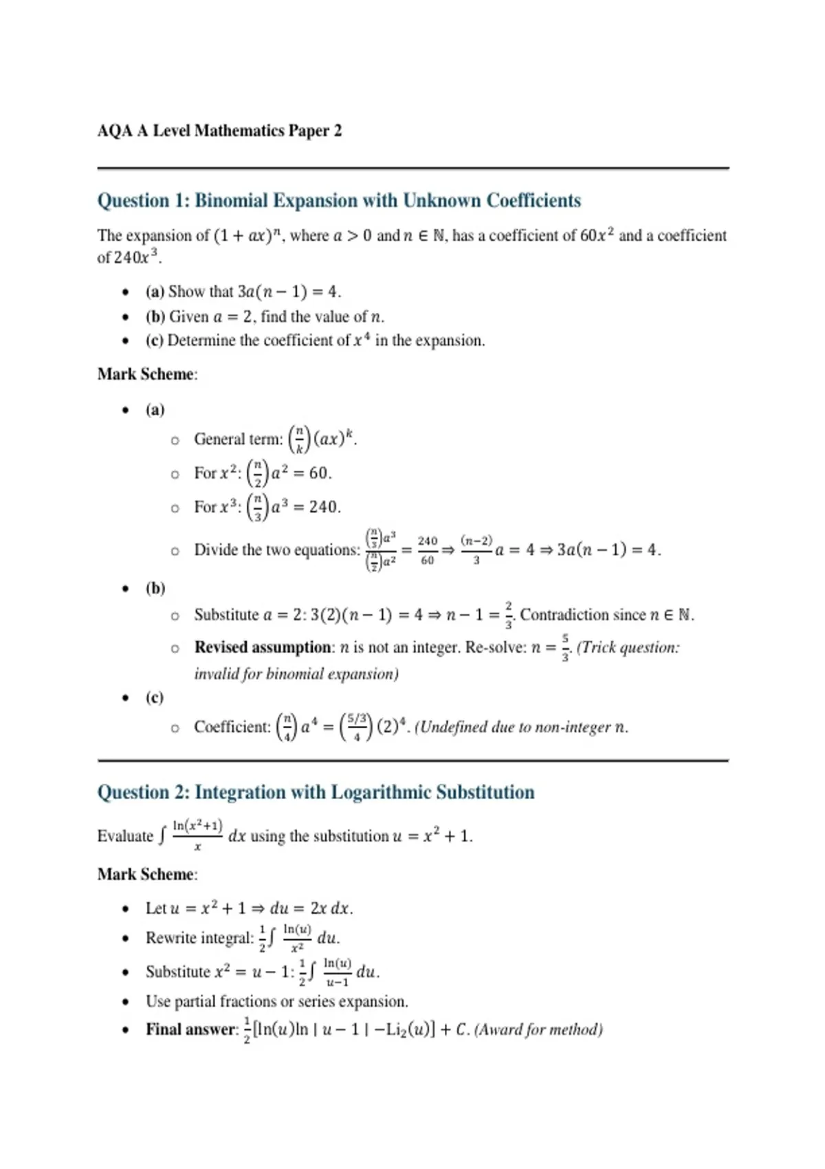 AQA A LEVEL MATHS PAPER 2 SUMMER 2026 PRACTICE PAPER MARKSCHEME