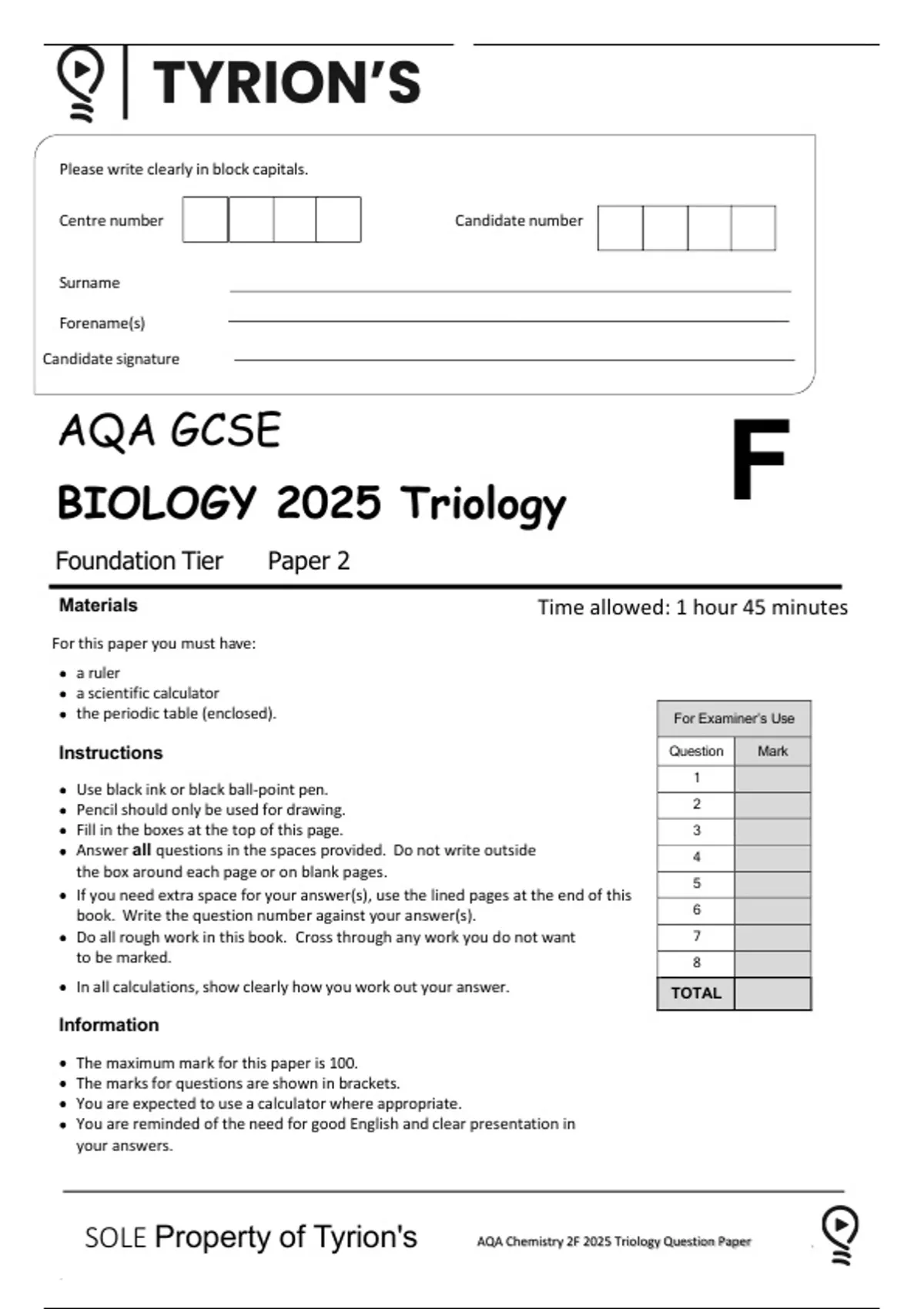 SOLE Property of Tyrion's AQA Chemistry 2F 2025 Triology