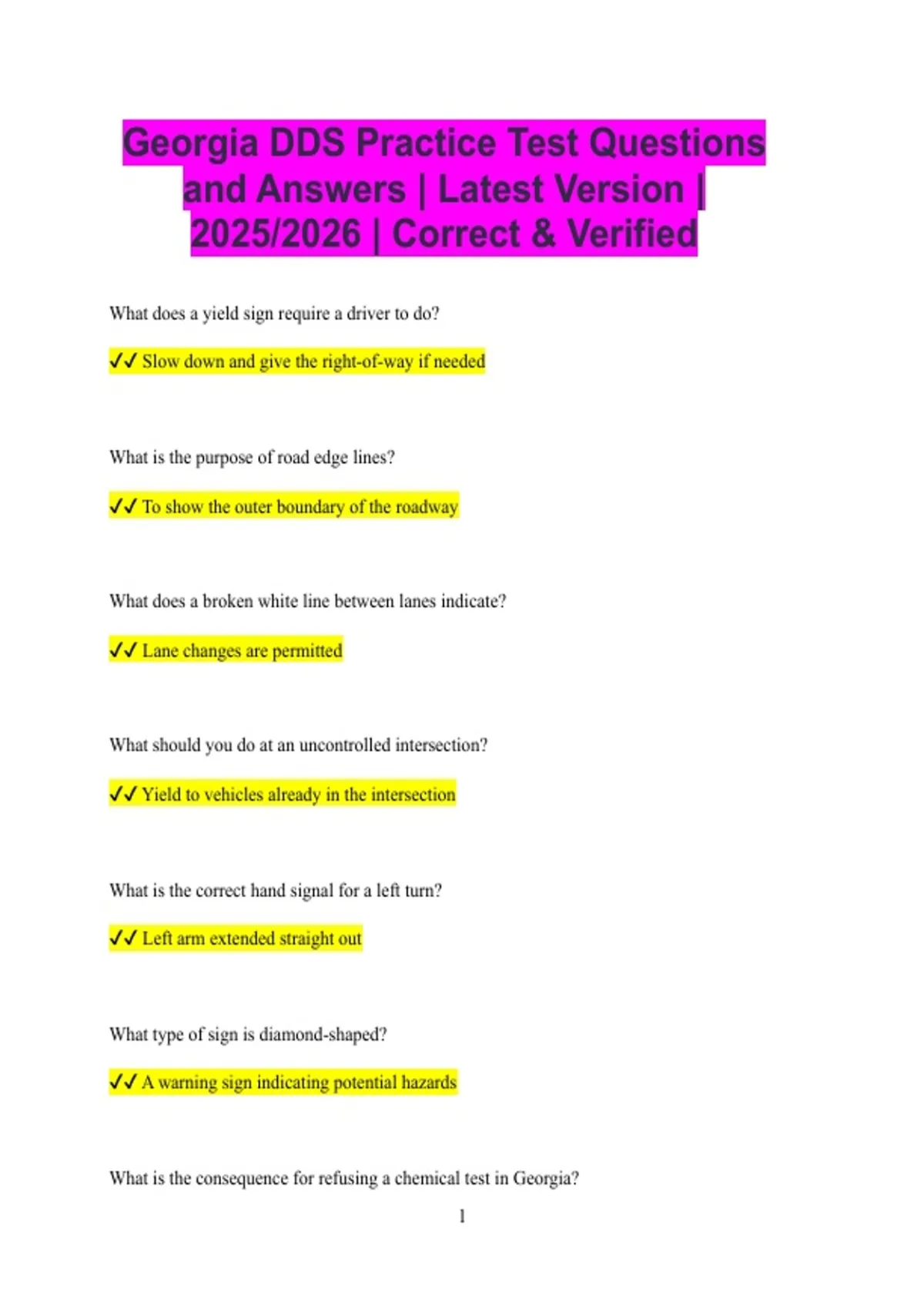 Georgia DDS Practice Test Questions and Answers | Latest Version | 2025/2026 | Correct & Verified What does a yield sign require a driver to do? Slow down and give the right-of-way if needed What is the purpose of road edge lines? To show the outer boundary of the roadway What does a broken white line between lanes indicate? Lane changes are permitted What should you do at an uncontrolled intersection? Yield to vehicles already in the intersection What is the correct hand signal for a left turn? Left arm extended straight out What type of sign is diamond-shaped? A warning sign indicating potential hazards What is the consequence for refusing a chemical test in Georgia? 2 Automatic license suspension What should you do if traffic signals are not working? Treat the intersection as a four-way stop What is the purpose of Georgia’s Move Over Law? To protect emergency and utility workers How far ahead should you signal before turning? At least 100 feet What is tailgating? Following another vehicle too closely What is the recommended following distance under normal driving conditions? At least three seconds What should you do if your brakes fail while driving? Downshift and use the parking brake carefully while steering straight What does a pentagon-shaped sign indicate? A school zone or school crossing 3 What does a red curb indicate? No stopping, standing, or parking What document is required to prove identity when applying for a learner’s permit? An original or certified birth certificate or valid passport Who must accompany a learner’s permit holder while driving? A licensed driver at least 21 years old How many hours of supervised driving are required before applying for a Class D license? 40 hours How many of the supervised driving hours must be at night? 6 hours What is the legal blood alcohol concentration (BAC) limit for drivers under 21 in Georgia? 0.02 percent What does a flashing red traffic light mean? Stop completely and proceed only when safe 4 What does a solid yellow line on your side of the road indicate? Passing is not allowed When approaching a stop sign, what is the correct action? Stop completely and yield to any pedestrians or other vehicles What is the speed limit in a Georgia school zone when lights are flashing? 25 miles per hour When are headlights required to be turned on in Georgia? From sunset to sunrise and during low visibility conditions What should you do if an emergency vehicle with sirens approaches? Pull over to the right and stop until the vehicle passes What does a green traffic arrow mean? You may proceed in the direction of the arrow What is hydroplaning? When your tires lose contact with the road due to water on the surface How should you react if your vehicle
