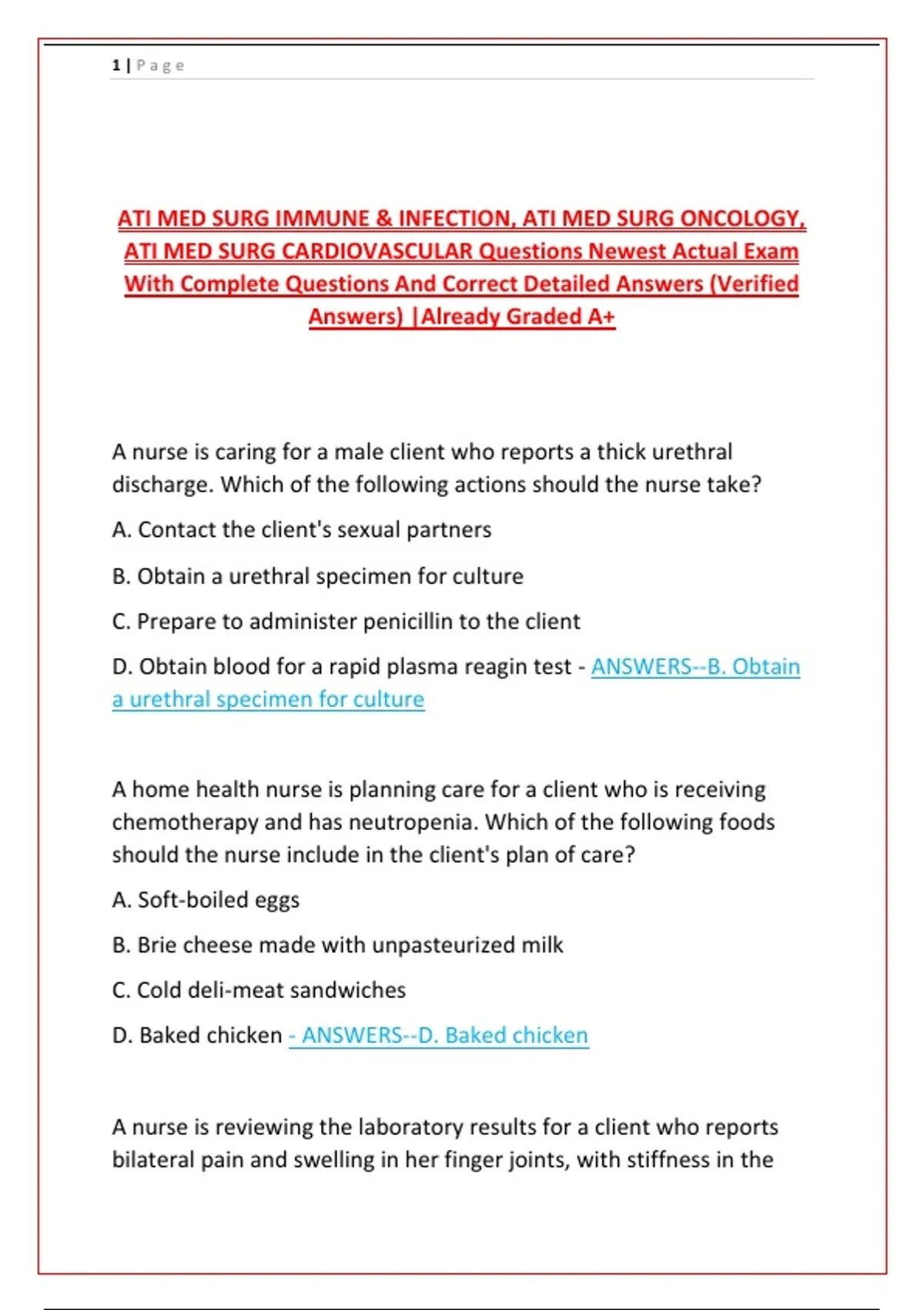 D. Obtain blood for a rapid plasma reagin test - ANSWERS--B. Obtain