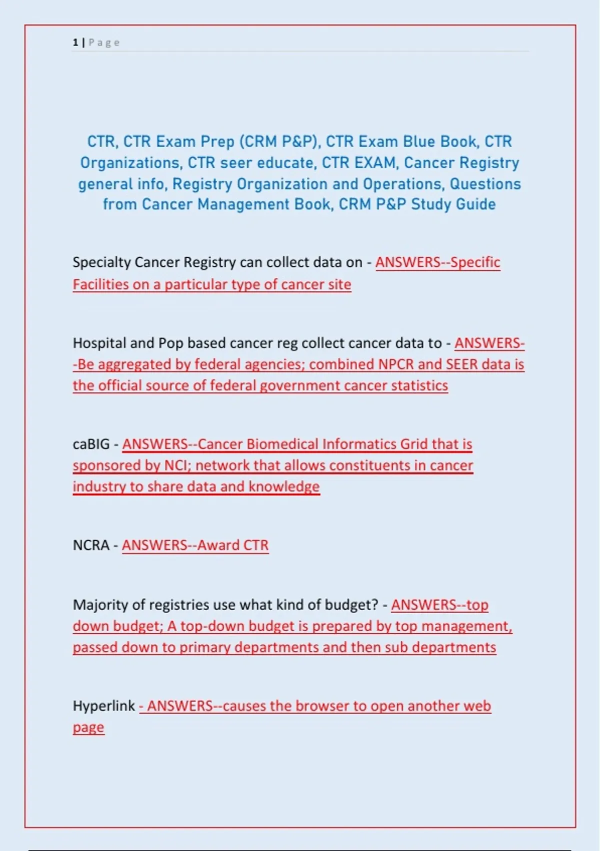Unlock the secrets to passing the Certified Tumor Registrar (CTR) exam with this powerhouse study companion! Packed with over 250 pages of expertly curated questions, answers, and in-depth explanations—this isn’t just another study guide; it’s your personal roadmap to certification success. Why This Guide Stands Out: All-In-One Prep: From cancer registry operations and HIPAA compliance to SEER, NPCR, NCDB, and AJCC staging—every critical topic is covered. Real-World Scenarios: Learn with practical Q&As based on actual CTR exam content and registry workflows. Confidence-Boosting Clarity: Complex concepts are broken down into digestible, easy-to-remember points. Exam-Ready Organization: Structured by subject and difficulty, helping you focus on your weakest areas and track your progress. Industry Trusted: Aligned with NCRA, NAACCR, CoC, and SEER standards—this is the material real registrars use.