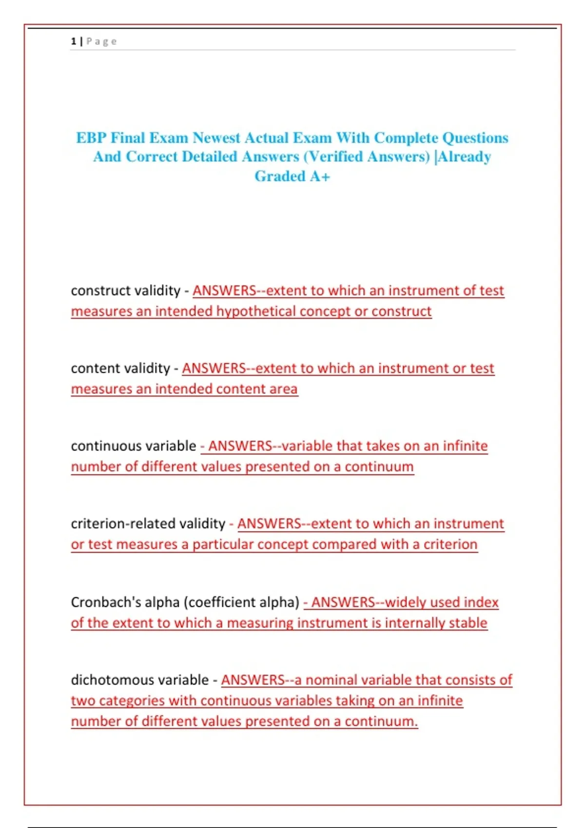 Unlock the secrets to mastering Evidence-Based Practice with this essential exam preparation tool! This PDF contains the newest actual exam questions—complete with verified answers and clear, concise rationales. Designed for nursing students, researchers, and healthcare professionals, it covers everything from research design and measurement validity to statistical analysis and qualitative methods. Each question is backed by detailed explanations that help you grasp complex concepts like reliability vs. validity, levels of measurement, data collection methods, and inferential statistics. Whether you’re studying for a final exam, preparing for certification, or strengthening your research skills, this guide is your key to success. Stop stressing—start mastering EBP with confidence. Download now and excel in your course!