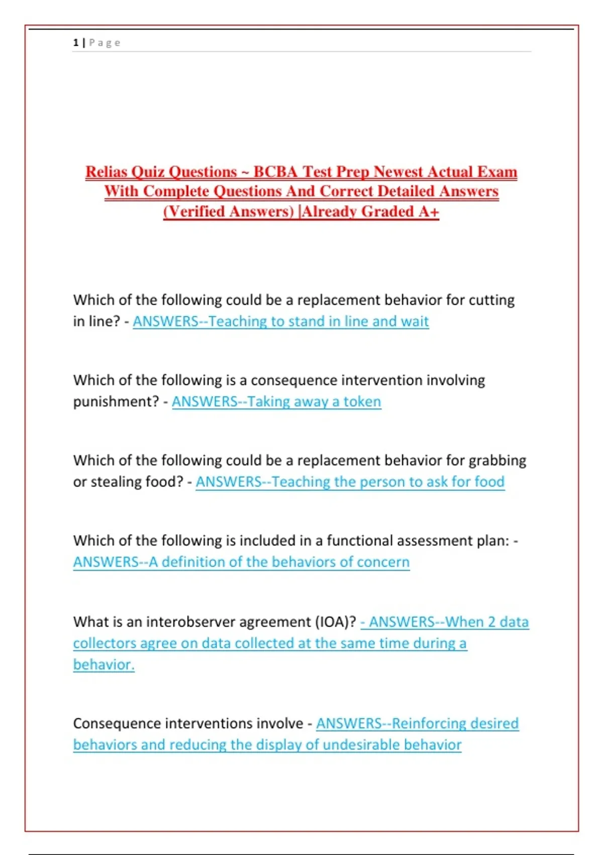 Unlock your BCBA certification success with this robust question bank drawn directly from Relias training modules! Packed with curated practice questions and in-depth explanations, this guide covers functional assessments, behavior intervention plans, ethical practice, supervision, telehealth, cultural humility, and more. Whether you're a first-time test-taker or refreshing your knowledge, these verified answers and clear rationales will sharpen your clinical reasoning and prepare you for the real exam. Study smarter, not harder!