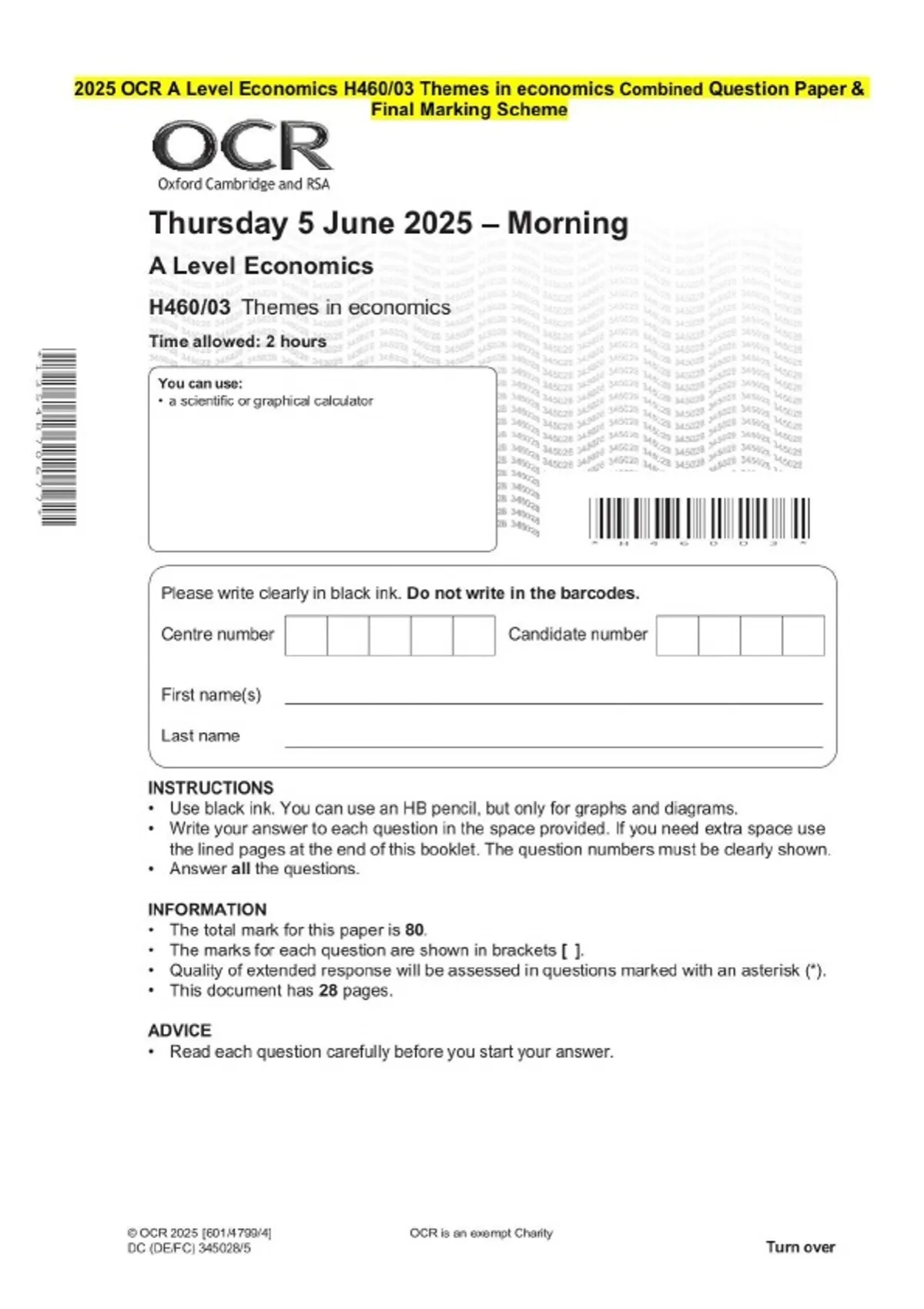 2025 OCR A Level Economics H460/03 Themes in economics Integrated Question Paper & Final Marking Scheme