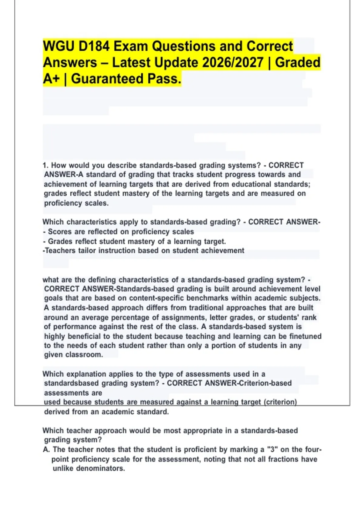 WGU D184 Exam Questions and Correct Answers – Latest Update 2026/2027 | Graded A+ | Guaranteed Pass. 1. .How .would .you .describe .standards-based .grading .systems? .- .CORRECT .ANSWER-A .standard .of .grading .that .tracks .student .progress .towards .and .achievement .of .learning .targets .that .are .derived .from .educational .standards; .grades .reflect .student .mastery .of .the .learning .targets .and .are .measured .on .proficiency .scales. Which .characteristics .apply .to .standards-based .grading? .- .CORRECT .ANSWER- - .Scores .are .reflected .on .proficiency .scales - .Grades .reflect .student .mastery .of .a .learning .target. -Teachers .uction .based .on .student .achievement what .are .the .defining .characteristics .of .a .standards-based .grading .system? .- .CORRECT .ANSWER-Standards-based .grading .is .built .around .achievement .level .goals .that .are .based .on .content-specific .benchmarks .within .academic .subjects. .A .standards-based .approach .differs .from .traditional .approaches .that .are .built .around .an .average .percentage .of .assignments, .s, .nts' .rank .of .performance .against .the .rest .of .the .class. .A .standards-based .system .is .highly .beneficial .to .the .student .because .teaching .and .learning .can .be .finetuned .to .the .needs .of .each .student . .only .a .portion .of .students .in .any .given .classroom. Which .explanation .applies .to .the .type .of .assessments .used .in .a .standardsbased .grading .system? .- .CORRECT .ANSWER-Criterion-based .assessments .are .used .because .students .are .measured .against .a .learning .target .(criterion) .derived .from .an .academic .standard. Which .ach .would .be .most .appropriate .in .a .standards-based .grading .system? A. .The . .that .the .student .is .proficient .by .marking .a ."3" .on .the .fourpoint .proficiency .scale . .assessment, .noting .that .not .all .fractions .have .unlike .denominators. B. .The . .that .the .student .is .not .proficient .by .marking .the .assessment .a ."2" .on .the .four-point .proficiency .scale .and .provides .support .to .the .student .to .help . .how .to .find .least .common .denominators. C. .The .rages .the .student .to .complete .an .extra-credit .assignment .by .making .a .video .about .why .math .can .be .fun .to .offset .the . .earned .on .the .assessment. D. .The .s .the .assessment .and .gives .the .student .a .grade .of .34 .percent .and .urges .the .student .to .reread .the . .the .textbook .about .adding .and .subtracting .fractions. .- .CORRECT .ANSWER-B. .The . .that .the .student .is .not .proficient .by .marking .the .assessment .a ."2" .on .the .fourpoint .proficiency .scale .and .provides .support .to .the .student .to .help .her .learn .how .to .find .least .common .denominators. With .a .standing .of .student .knowledge .and .next .steps .ess, .this . .empowered .to .support .the .student .in .attaining .goals .and .gaining .confidence .through .encouragement .and .guidance. .- .CORRECT .ANSWER-Stakeholder Based .on .the .percentage .average .of .all .grades .tic .grades .- .CORRECT .ANSWER-traditional .grading .system Based .on .different .proficiency .levels .of .standards .- .CORRECT .ANSWERstandard .based .grading .system Single .grade .given .e .on .report .cards .- .CORRECT .ANSWER-traditional .grading .system Grade .based .on .most .recent .evidence .- .CORRECT .ANSWER-traditional .grading .system Knowing .tations .and .level .of .proficiency .allows .this . .set .personal .goals, .make .improvements .with .practice, .demonstrate .knowledge .by .meeting .expectations, .and .persevere .through .challenges .by .continued .effort. .- .CORRECT .ANSWER-Student Stakeholders .need .s .to .understand .a .student's .academic .performance. .True .of .false? .- .CORRECT .ANSWER-False Which .nse .would .help .the .parent .understand .standards-based .grading .report .cards? Unequivocal .knowledge .of .instructional .needs .and .useful .interventions . .student .will .guide .this .stakeholder's .future .instruction. .- .CORRECT .ANSWERTeacher A. .Sympathize .with .the .parent .and .share .the .challenges .they .are .having .with .standards-based .grading .so .the .parent .knows .it .is .a .difficult .system .for .everyone B. .Review .the .report .card .and .standards .with .the .parent, .explaining .how .the .standards .are .assessed .and .clarifying .the .grading .scale .that .is .used C. .Provide .the .parent .with .a .percentage .and . .equivalent . .subject .area .every .nine .weeks D. .Explain .to .the .parent .that .if . .has .the .highest . .the .grading .scale, .it .is .the .same .as .having .an .A .- .CORRECT .ANSWER-B. .Review .the .report .card .and .standards .with .the .parent, .explaining .how .the .standards .are .assessed .and .clarifying .the .grading .scale .that .is .used True .or.False Focus .statements .are .important .enough .to .be .assessed .multiple .times .at .the .school .ict .level .to .determine .the .most .accurate .scores .idual .students. .- .CORRECT .ANSWER-False Measurement .statements .are .important .enough .to .be .assessed .multiple .times .to .determine .the .most .accurate .scores .idual .students. .True .? .- .CORRECT .ANSWER-True What .purpose .do .focus .sta