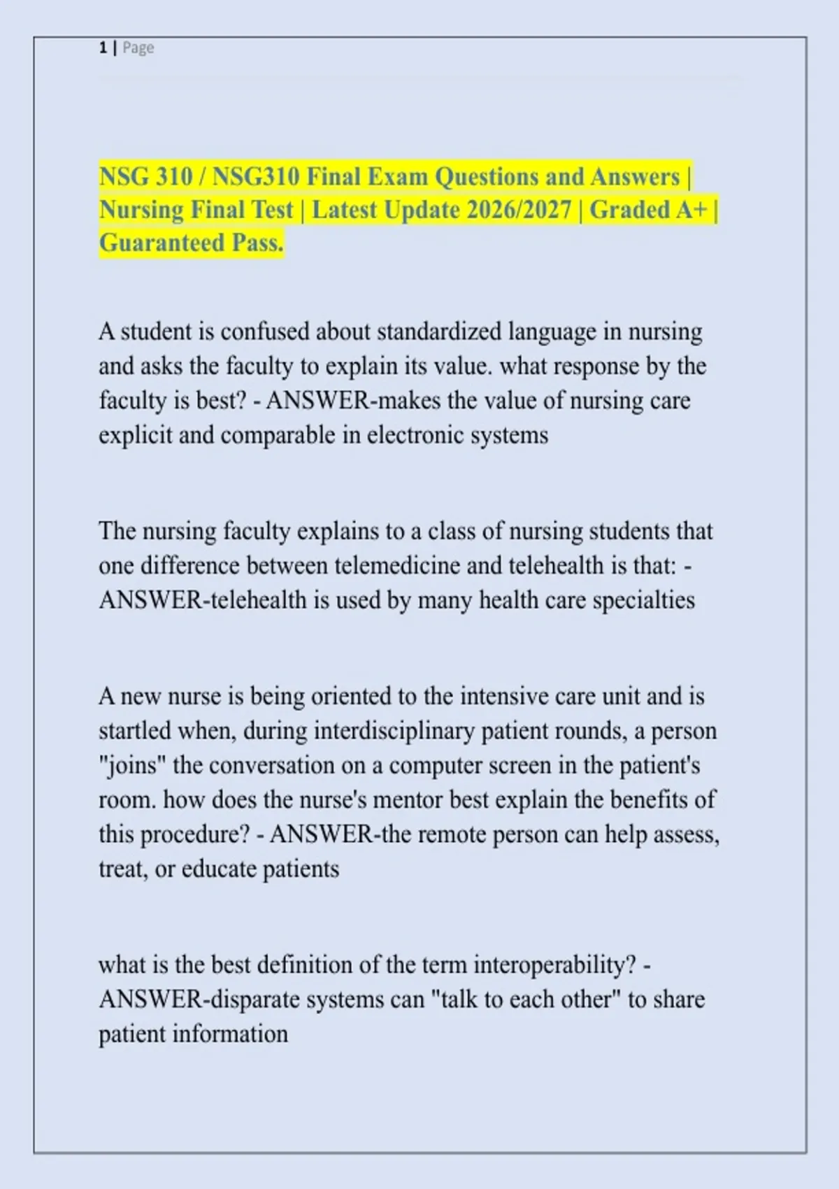 NSG 310 / NSG310 Final Exam Questions and Answers | Nursing Final Test | Latest Update 2026/2027 | Graded A+ | Guaranteed Pass. A student is confused about standardized language in nursing and asks the faculty to explain its value. what response by the faculty is best? - ANSWER-makes the value of nursing care explicit and comparable in electronic systems The nursing faculty explains to a class of nursing students that one difference between telemedicine and telehealth is that: - ANSWER-telehealth is used by many health care specialties A new nurse is being oriented to the intensive care unit and is startled when, during interdisciplinary patient rounds, a person "joins" the conversation on a computer screen in the patient's room. how does the nurse's mentor best explain the benefits of this procedure? - ANSWER-the remote person can help assess, treat, or educate patients what is the best definition of the term interoperability? - ANSWER-disparate systems can "talk to each other" to share patient information 2 | Page what statement is accurate when describing characteristics of an electronic health information technology system? - ANSWER-it provides accessibility to multiple health records. when working on a hospital unit, the nurse uses a cellular telephone as an aid to giving patient care. when using a cellular telephone, the nurse recognizes that a barrier to this type of technology is - ANSWER-some hospitals prohibit using cellular telephones which of these engages patients as partners in health care, is an expectation at the beginning staff nurse job level, and is among items tested on licensure exams? - ANSWER-HIT (health information technology system) Rationale: one of the QSEN and provides safer care and better communication 3 | Page the nurse is using a wireless handheld device. when using such a device, the nurse recognizes that it - ANSWER-track a patient's medications and dosages what is the advantage of coding in the use of electronic health records (EHRs)? - ANSWER-it allows information to be communicated and extracted from EHRs which statement concerning electronic records is NOT true? - ANSWER-they are less durable than paper charting Which of the following is the best definition of information literacy? - ANSWER-the ability to find, retrieve, analyze, and use information According to HIPPA, which of the following people cannot have access to a patient's chart without prior consent? - ANSWER-the patient's adult children An 84 year old Spanish speaking male patient is hospitalized due to a broken hip. When administering a new medication for 4 | Page the patient, to whom in the room should the nurse focus their education about the medication? - ANSWER-the patient himself Which behavioral teaching method is the reinforcement of successive steps toward the target behavior? - ANSWERshaping rationale: t's when a long term goal is broken down in steps, and each time a client takes a step closer to the desired behavior you want to definitely reinforce them so that they want to keep on going. modeling is learning a behavior by observing others while they're performing it, so our patients are going to model what we do, whether it's right or wrong. coaching is tailored support for people learning an unfamiliar task or procedure, it builds on the client strengths, rather than attempting to fix a weakness and it's in order to develop and improve self management skill in health