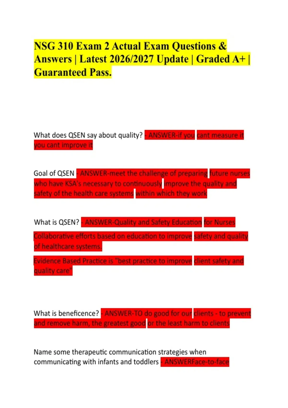 NSG 310 Exam 2 Actual Exam Questions & Answers | Latest 2026/2027 Update | Graded A+ | Guaranteed Pass. What does QSEN say about quality? - ANSWER-if you cant measure it you cant improve it Goal of QSEN - ANSWER-meet the challenge of preparing future nurses who have KSA's necessary to continuously improve the quality and safety of the health care systems within which they work What is QSEN? - ANSWER-Quality and Safety Education for Nurses Collaborative efforts based on education to improve safety and quality of healthcare systems. Evidence Based Practice is "best practice to improve client safety and quality care" What is beneficence? - ANSWER-TO do good for our clients - to prevent and remove harm, the greatest good or the least harm to clients Name some therapeutic communication strategies when communicating with infants and toddlers - ANSWERFace-to-face position bending or moving to the child's eye level maintaining eye contact Reassuring facial expression help in interaction with infants and toddlers Which ethical principle is most important for being involved in informed consent? - ANSWER-Autonomy - Key element of management of care, including advance directives, advocacy, client rights, HIPAA, confidentiality, and informed consent Right to privacy and self-determination When is it okay to disclose personal information? - ANSWER-Only in the best interests of a client For example: You have three kids who have all been breastfeed and are healthy individuals. You come across a client who has a newborn and needs advice with breastfeeding. It is okay to disclose personal information in this case. What are some ways to prevent adverse events due to negligence? - ANSWER-Can be prevented by answering a call light in a timely manner Describe emerging technology trends such as the barcode system and health information technologies (HIT)? - ANSWER-The usage of HIT and bar-code client name bands improves safety when they are used properly. The use of HITs includes the electronic transmission of prescriptions which involves sending medication orders directly to the pharmacy with reductions in errors. What is important for the nurse to know when communicating with the Hispanic culture? - ANSWERHispanics value interpersonal family relationships and are very affectively oriented for feelings and not prone to asking a lot of question. Hispanics have strong family loyalty What is an ameliorable adverse event? - ANSWER-Events that, while not preventable, could have been less harmful if care had been different What is an adverse event due to negligence? - ANSWERAdverse events due to negligence include those due to care that fall below the standards expected of clinicians in the community What variable affects how a message is received in Linear and Transactional models of communication? - ANSWER- . What is the major factor that contributes to the harmful error? - ANSWER-miscommunication You are attempting a foley catheter and the client yells stop. What is the best nursing action at this point? - ANSWER-(1) Stop. (2) Attempt to find out why. How should the nurse communicate with a client with dementia? - ANSWER-The nurse should use the words directly applicable to the client's daily routine, like "before lunch". Simple conversations - yes and no questions Clients with dementia can become anchored in the present time, space, and humanity when touched What is therapeutic communication? - ANSWERTherapeutic communication is defined as a dynamic interactive process consisting of words and actions, and entered into by a clinician and client for the purpose of achieving identified health-related goals Its purpose is always to promote the client's personal development and improve health outcomes What does cultural competence include? - ANSWERRequires selfawareness of one's own cultural values first followed by developing knowledge and acceptance of cultural differences in others