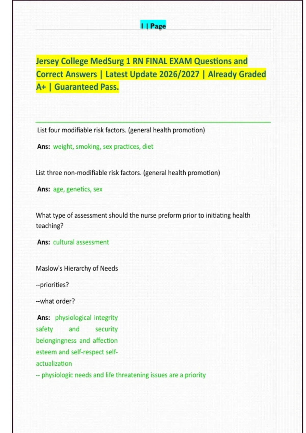 Jersey College MedSurg 1 RN FINAL EXAM Questions and Correct Answers | Latest Update 2026/2027 | Already Graded A+ | Guaranteed Pass. List four modifiable risk factors. (general health promotion) Ans: weight, smoking, sex practices, diet List three non-modifiable risk factors. (general health promotion) Ans: age, genetics, sex What type of assessment should the nurse preform prior to initiating health teaching? Ans: cultural assessment Maslow's Hierarchy of Needs --priorities? --what order? Ans: physiological integrity safety and security belongingness and affection esteem and self-respect selfactualization -- physiologic needs and life threatening issues are a priority Ans: © 2025/ 2026 | ® All rights reserved -- confirm that these needs are met in the order listed above Organization that identifies health promotion and disease prevention goals and lists strategies along with resources in an attempt to improve the nation's health Healthy People 2020 This governs nursing practice and is a law that is put into place to protect the public - nurses must follow and comply with their state's regulations Ans: Nurse Practice Acts Institute that seeks to strengthen the knowledge, skills, and attitudes of nurses in providing continuous quality improvement in health care Ans: QSEN - Quality and Safety Education for Nurses Institute What is pain? Ans: whatever the patient says it is Pain is associated with __________________________________. Ans: actual or potential tissue damage The single most reliable indicator of pain is _______. the patient's self report Ans: © 2025/ 2026 | ® All rights reserved 3 | Page Pain stimulates the sympathetic nervous system and could result in an increase in ___________, ___________, and ____________. Ans: blood pressure, heart rate, and respirations Organization that recommends ways to strengthen the practice of nursing in order to improve health care. Ans: The Institute of Medicine's report on the Future of Nursing The Joint Commission lists the top patient safety concerns and includes medication safety, infection prevention, surgery-related mistakes, patient identification and improving staff communication. What is this list called? Ans: The National Patient Safety Goals physiologic effects of unrelieved pain (4) Ans: increases glucagon production decreases insulin secretion depresses immune function can lead to addictive behaviors initiate inflammation and contribute to tissue swelling and pain Ans: prostaglandins ______ primarily produce pain relief by preventing prostaglandin formation. Ans: NSAIDS Ans: © 2025/ 2026 | ® All rights reserved _____________ does not have anti-inflammatory properties. Ans: Acetaminophen ________________ could lead to allodynia. Ans: nerve route injury What does a comprehensive pain assessment include? Ans: timing: onset - when it started duration - where it started frequency - how often/for how long type - includes intensity, associated factors influencing factors - what makes it better/worse intensity - how bad does it hurt quality - what does it feel like location - where does it hurt effects on function/daily activities Ans: © 2025/ 2026 | ® All rights reserved 5 | Page 10cm line that represents no pain to worst pain on each end of the line and the patient places a mark somewhere between the two ends depending on the severity of pain visual analog scale ranges from 0 to 10 with 0 representing no pain Ans: numeric rating scale consists of cartoon faces that the patient selects to report their pain Ans: Wong-Baker FACES Scale (ages 3+) uses words to help individuals describe the intensity of their pain Ans: verbal descriptor scale ______________ stimulates the inflammatory response and puts the patient at risk for pain. Ans: tissue damage manage nociceptive pain with? local anesthetics, non-opioids or opioids pain that is associated with a noxious stimulus Ans: allodynia Ans: © 2025/ 2026 | ® All rights reserved should never be used by the provider to match the patient's facial expression Ans: Wong-Baker FACES Scale effect produced by topical analgesics Ans: produce a local effect effect produced by transdermal route of analgesics