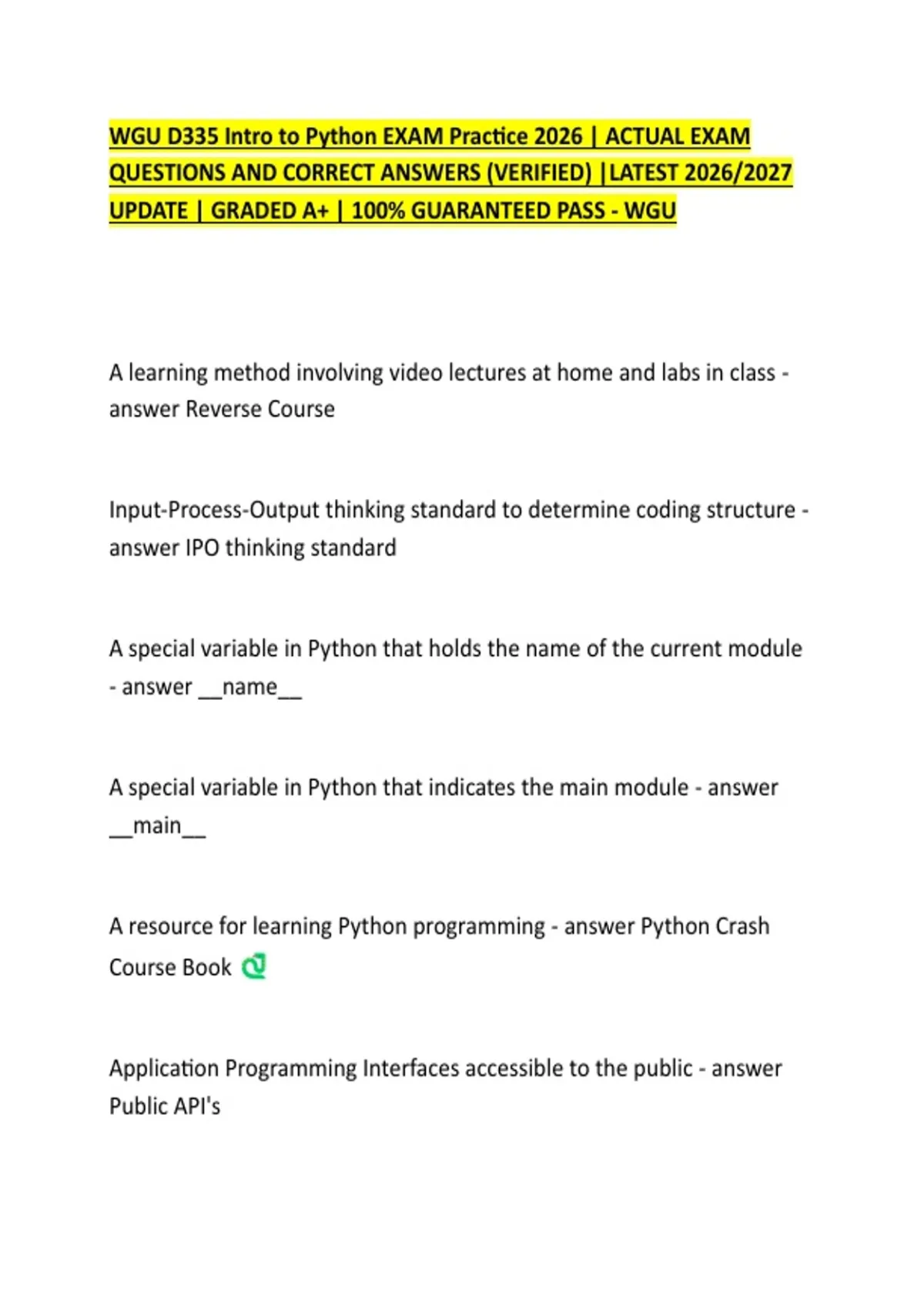 WGU D335 Intro to Python EXAM Practice 2026 | ACTUAL EXAM QUESTIONS AND CORRECT ANSWERS (VERIFIED) |LATEST 2026/2027 UPDATE | GRADED A+ | 100% GUARANTEED PASS - WGU A learning method involving video lectures at home and labs in class - answer Reverse Course Input-Process-Output thinking standard to determine coding structure - answer IPO thinking standard A special variable in Python that holds the name of the current module - answer __name__ A special variable in Python that indicates the main module - answer __main__ A resource for learning Python programming - answer Python Crash Course Book Application Programming Interfaces accessible to the public - answer Public API's Time management method using a timer to break work into intervals - answer Pomodoro Technique Ordered collection of items in Python denoted by square brackets - answer Lists