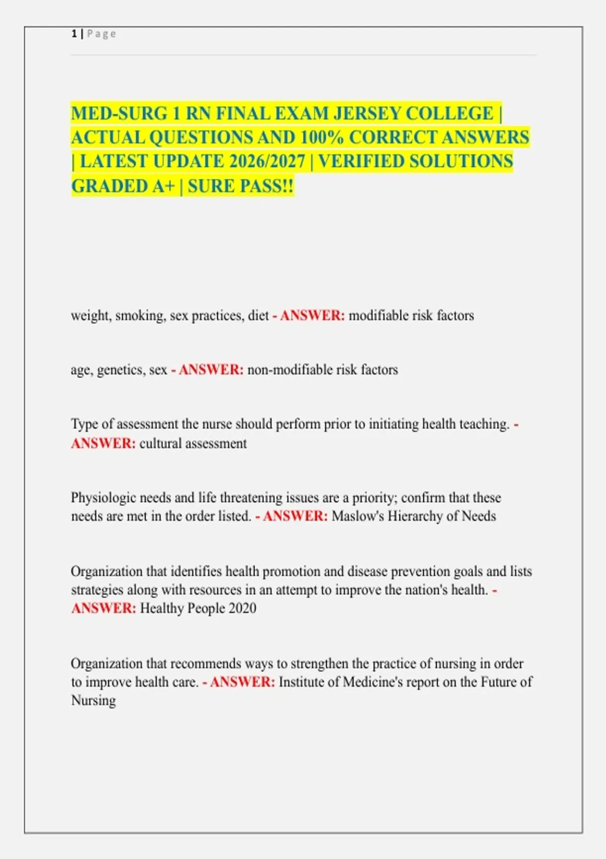 MED-SURG 1 RN FINAL EXAM JERSEY COLLEGE | ACTUAL QUESTIONS AND 100% CORRECT ANSWERS | LATEST UPDATE 2026/2027 | VERIFIED SOLUTIONS GRADED A+ | SURE PASS!! Type of assessment the nurse should perform prior to initiating health teaching. - ANSWER: cultural assessment Physiologic needs and life threatening issues are a priority; confirm that these needs are met in the order listed. - ANSWER: Maslow's Hierarchy of Needs Organization that identifies health promotion and disease prevention goals and lists strategies along with resources in an attempt to improve the nation's health. - ANSWER: Healthy People 2020 Organization that recommends ways to strengthen the practice of nursing in order to improve health care. - ANSWER: Institute of Medicine's report on the Future of Nursing 2 | P a g e The Joint Commission lists the top patient safety concerns and includes medication safety, infection prevention, surgery-related mistakes, patient identification and improving staff communication. - ANSWER: National Patient Safety Goals This governs nursing practice and is a law that is put into place to protect the public; nurses must follow and comply with their state's regulations. - ANSWER: Nurse Practice Acts Quality and Safety Education for Nurses Institute; seeks to strengthen the knowledge, skills, and attitudes of nurses in providing continuous quality improvement in health care. - ANSWER: QSEN Pain stimulates the sympathetic nervous system and could result in an increase in blood pressure, heart rate, and respirations. - ANSWER: sympathetic nervous system Increases glucagon production, decreases insulin secretion, depresses immune function, can lead to addictive behaviors. - ANSWER: physiologic effects of unrelieved pain Initiate inflammation and contribute to tissue swelling and pain. - ANSWER: prostaglandins Primarily produce pain relief by preventing prostaglandin formation. - ANSWER: NSAIDS Does not have anti-inflammatory properties. - ANSWER: Acetaminophen 3 | P a g e Tissue damage stimulates the inflammatory response and puts the patient at risk for pain. - ANSWER: inflammatory response Manage with local anesthetics, non-opioids or opioids. - ANSWER: nociceptive pain management Whatever the patient says it is. - ANSWER: pain Pain is associated with actual or potential tissue damage. - ANSWER: tissue damage The patient's self report. - ANSWER: single most reliable indicator of pain Pain that is associated with a noxious stimulus. - ANSWER: allodynia Could lead to allodynia. - ANSWER: nerve route injury Includes timing (onset, duration, frequency), type (intensity, associated factors), influencing factors, quality, location, and effects on function/daily activities. - ANSWER: comprehensive pain assessment 10cm line that represents no pain to worst pain on each end of the line and the patient places a mark somewhere between the two ends depending on the severity of pain - ANSWER: visual analog scale ranges from 0 to 10 with 0 representing no pain - ANSWER: numeric rating scale 4 | P a g e consists of cartoon faces that the patient selects to report their pain - ANSWER: Wong-Baker FACES Scale (ages 3+) effect produced by transdermal route of analgesics - ANSWER: produces drug absorption into the systemic circulation to help reduce complications related to pain. Used in postoperative patients as a preventative measure for pain. - ANSWER: provide PCA (patient controlled analgesia) administration of analgesics for chronic and postoperative pain, never wait for chronic pain to reoccur. - ANSWER: around the clock given for mild to moderate pain - ANSWER: aspirin or acetaminophen given for severe pain - ANSWER: opioid analgesics (Morphine) Avoid which medication administration route for patients who are thrombocytopenic? - ANSWER: rectal route needed for renal blood flow - ANSWER: prostaglandin constipation, nausea, pupil constriction, and respiratory depression - ANSWER: undesirable side effects of opioids