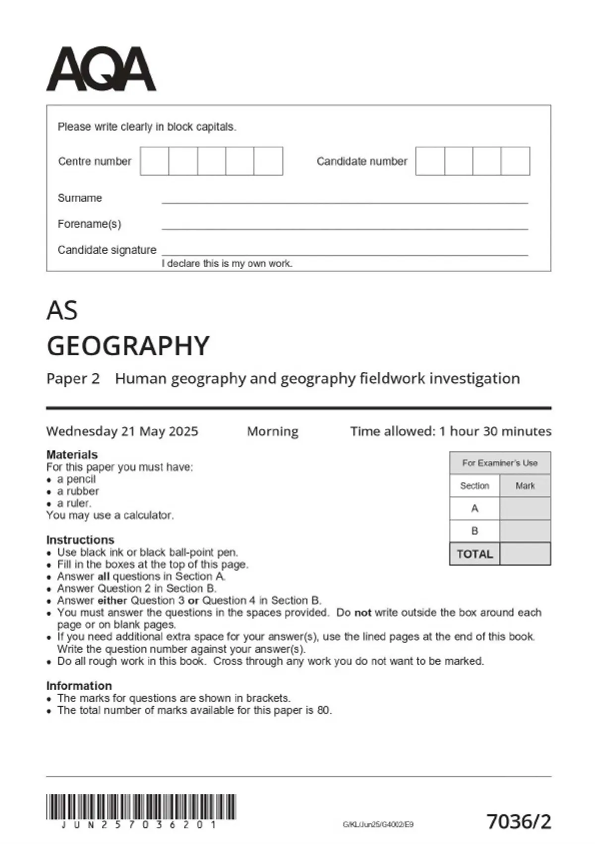 2025 AQA AS Geography 7036/2 PAPER 2 Human geography and the geography fieldwork investigation MERGED QUESTION PAPER & MARKSCHEME