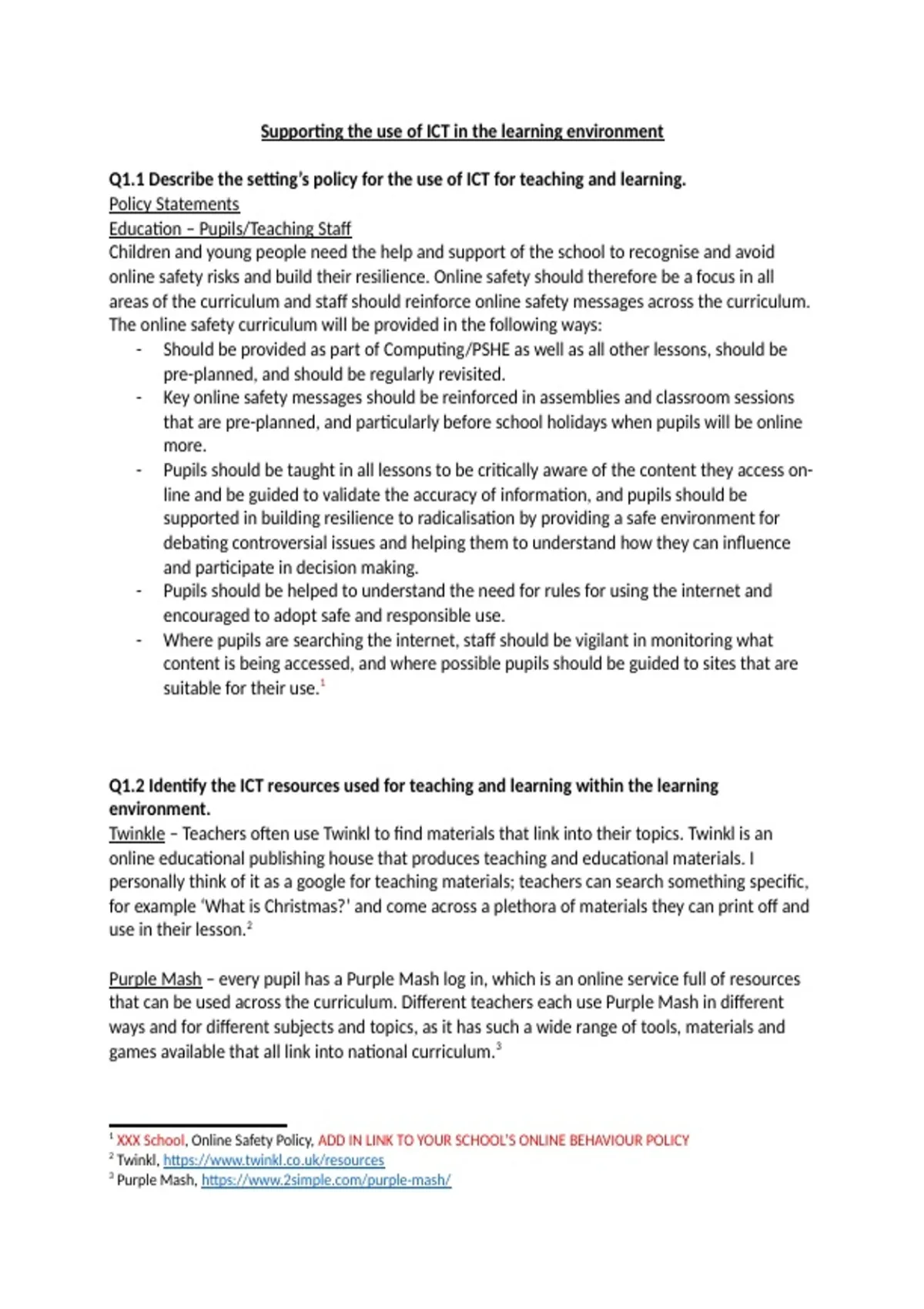 Q1.1 Describe the setting’s policy for the use of ICT for teaching and learning.