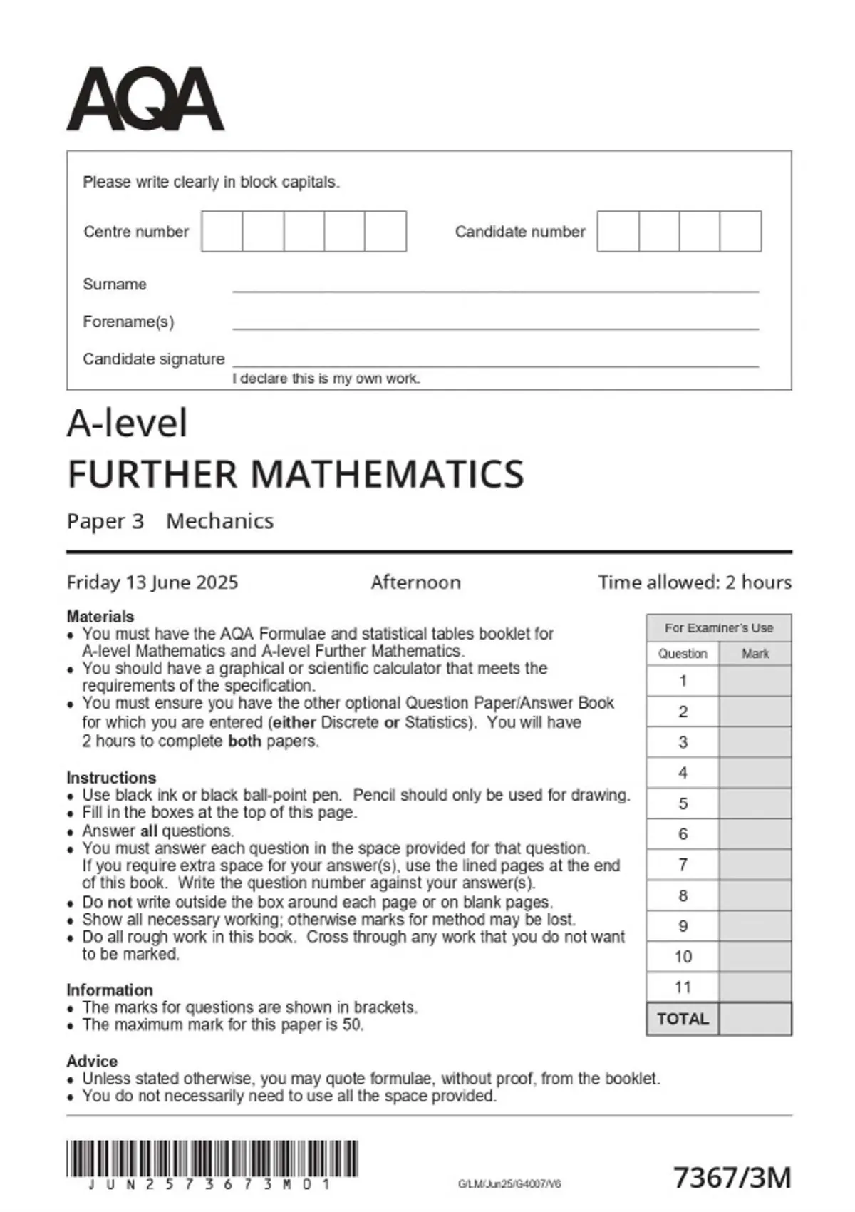 2025 AQA A-LEVEL Further Mathematics 7367/3M Paper 3M: Mechanics MERGED QUESTION PAPER & MARKSCHEME
