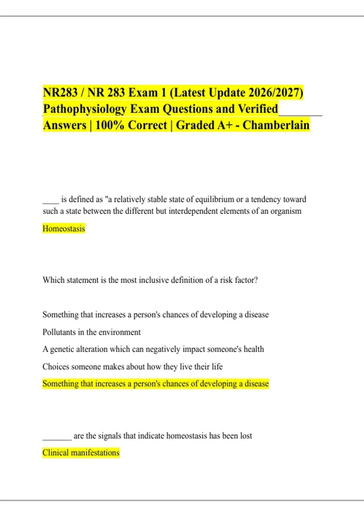 NR283 / NR 283 Exam 1 (Latest Update 2026/2027) Pathophysiology Exam Questions and Verified Answers | 100% Correct | Graded A+ - Chamberlain