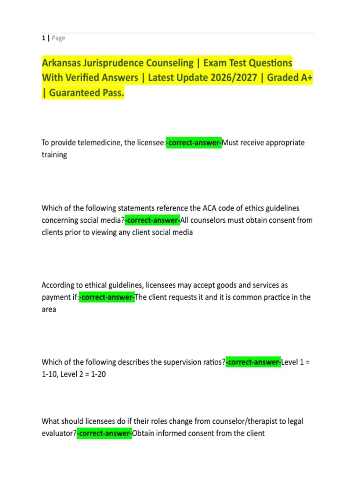 Arkansas Jurisprudence Counseling | Exam Test Questions With Verified Answers | Latest Update 2026/2027 | Graded A+ | Guaranteed Pass. To provide telemedicine, the licensee:-correct-answer-Must receive appropriate training Which of the following statements reference the ACA code of ethics guidelines concerning social media?-correct-answer-All counselors must obtain consent from clients prior to viewing any client social media According to ethical guidelines, licensees may accept goods and services as payment if:-correct-answer-The client requests it and it is common practice in the area Which of the following describes the supervision ratios?-correct-answer-Level 1 = 1-10, Level 2 = 1-20 What should licensees do if their roles change from counselor/therapist to legal evaluator?-correct-answer-Obtain informed consent from the client 2 | Page Licensees are required to report their client contact hours to the state board:correct-answer-Every six months