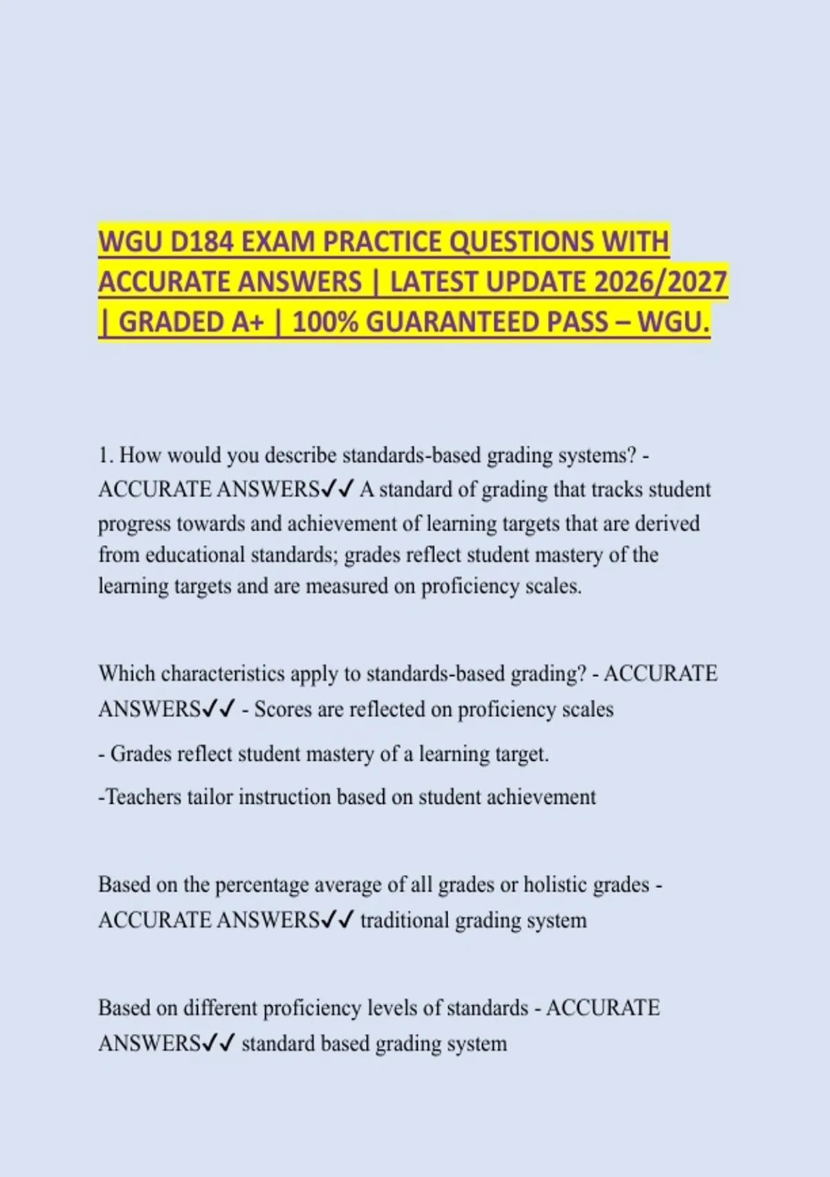 WGU D184 EXAM PRACTICE QUESTIONS WITH ACCURATE ANSWERS | LATEST UPDATE 2026/2027 | GRADED A+ | 100% GUARANTEED PASS – WGU. 1. How would you describe standards-based grading systems? - ACCURATE ANSWERS A standard of grading that tracks student progress towards and achievement of learning targets that are derived from educational standards; grades reflect student mastery of the learning targets and are measured on proficiency scales. Which characteristics apply to standards-based grading? - ACCURATE ANSWERS - Scores are reflected on proficiency scales - Grades reflect student mastery of a learning target. -Teachers tailor instruction based on student achievement Based on the percentage average of all grades or holistic grades - ACCURATE ANSWERS traditional grading system Based on different proficiency levels of standards - ACCURATE ANSWERS standard based grading system Single grade given per course on report cards - ACCURATE ANSWERS traditional grading system Which explanation applies to the type of assessments used in a standards-based grading system? - ACCURATE ANSWERS Criterion-based assessments are used because students are measured against a learning target (criterion) derived from an academic standard. Which teacher approach would be most appropriate in a standards-based grading system? A. The teacher notes that the student is proficient by marking a "3" on the four-point proficiency scale for the assessment, noting that not all fractions have unlike denominators. B. The teacher notes that the student is not proficient by marking the assessment a "2" on the four-point proficiency scale and provides support to the student to help her learn how to find least common denominators. C. The teacher encourages the student to complete an extra-credit assignment by making a video about why math can be fun to offset the poor grade earned on the assessment. D. The teacher scores the assessment and gives the student a grade of 34 percent and urges the student to reread the chapter in the textbook about adding and subtracting fractions. - ACCURATE ANSWERS B. The teacher notes that the student is not proficient by marking the assessment a "2" on the four-point proficiency scale and provides support to the student to help her learn how to find least common denominators. With a clear understanding of student knowledge and next steps for progress, this stakeholder is empowered to support the student in attaining goals and gaining confidence through encouragement and guidance. - ACCURATE ANSWERS Stakeholder Grade based on most recent evidence - ACCURATE ANSWERS traditional grading system what are the defining characteristics of a standards-based grading system? - ACCURATE ANSWERS Standards-based grading is built around achievement level goals that are based on content-specific benchmarks within academic subjects. A standards-based approach differs from traditional approaches that are built around an average percentage of assignments, letter grades, or students' rank of performance against the rest of the class. A standards-based system is highly beneficial to the student because teaching and learning can be fine-tuned to the needs of each student rather than only a portion of students in any given classroom. Unequivocal knowledge of instructional needs and useful interventions for each student will guide this stakeholder's future instruction. - ACCURATE ANSWERS Teacher Knowing their expectations and level of proficiency allows this stakeholder to set personal goals, make improvements with practice, demonstrate knowledge by meeting expectations, and persevere through challenges by continued effort. - ACCURATE ANSWERS Student