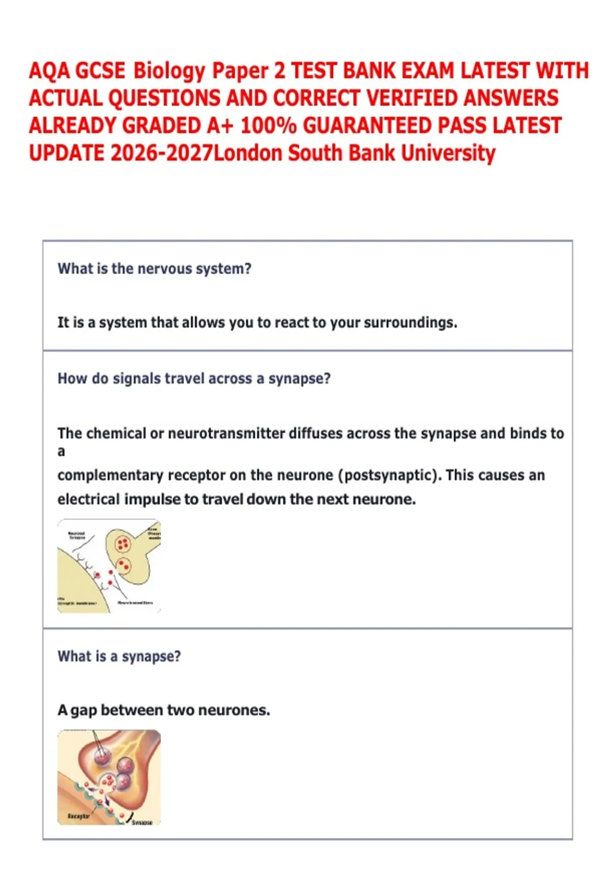 AQA GCSE Biology Paper 2 TEST BANK EXAM LATEST WITH ACTUAL QUESTIONS AND CORRECT VERIFIED ANSWERS ALREADY GRADED A+ 100% GUARANTEED PASS LATEST UPDATE London South Bank University