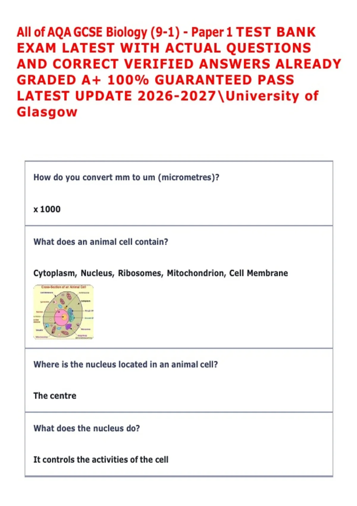 AQA GCSE Biology (9-1) - Paper 1 TEST BANK EXAM LATEST WITH ACTUAL QUESTIONS AND CORRECT VERIFIED ANSWERS ALREADY GRADED A+ 100% GUARANTEED PASS LATEST UPDATE University of Glasgow